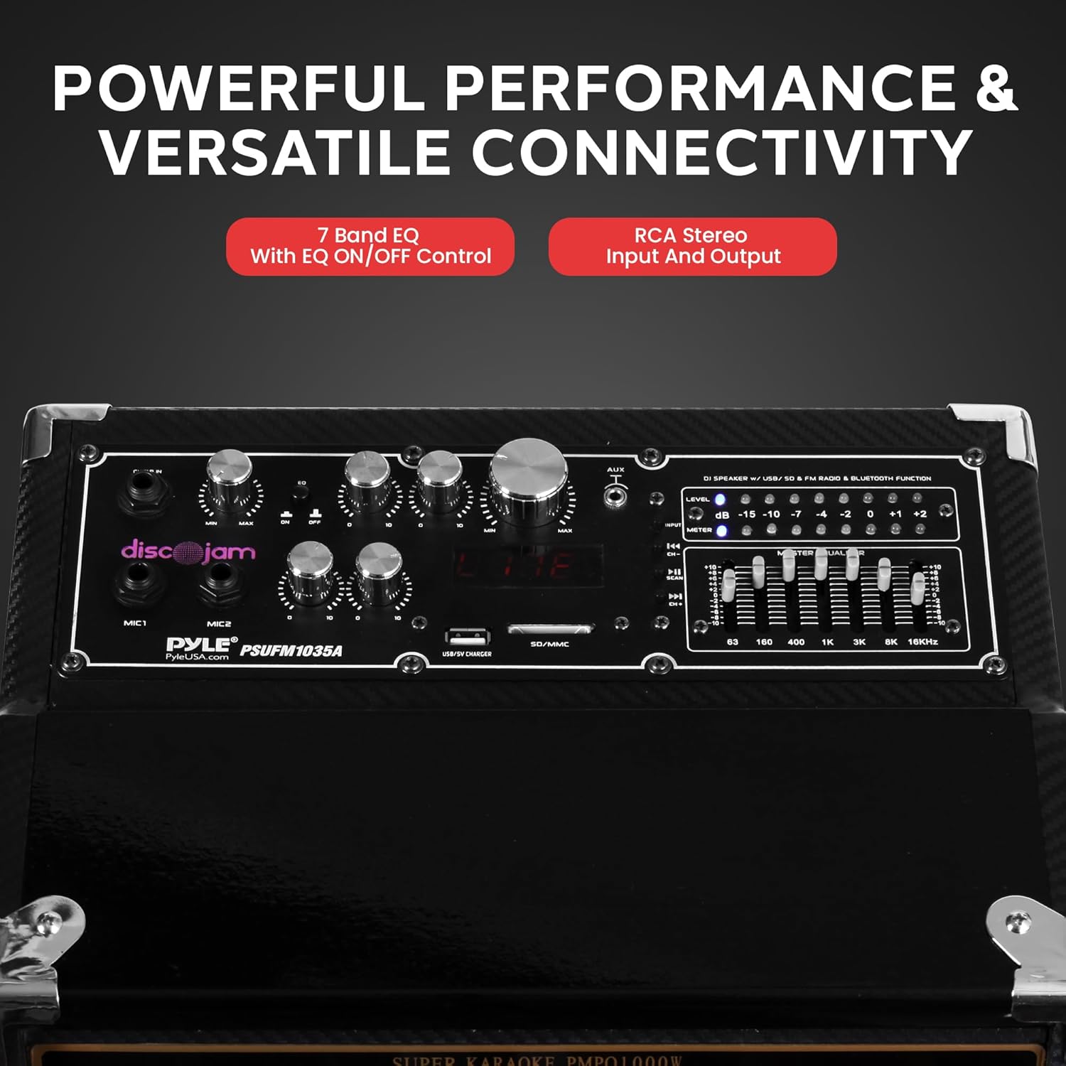 • COMPATIBLE WITH BLUETOOTH: This box type disco jam powered loud speaker is compatible w/ bluetooth for wireless audio streaming and works w/ devices like iPhone, android mobile phone, iPad, tablet, PC. Ideal for personal indoor home and outdoor use