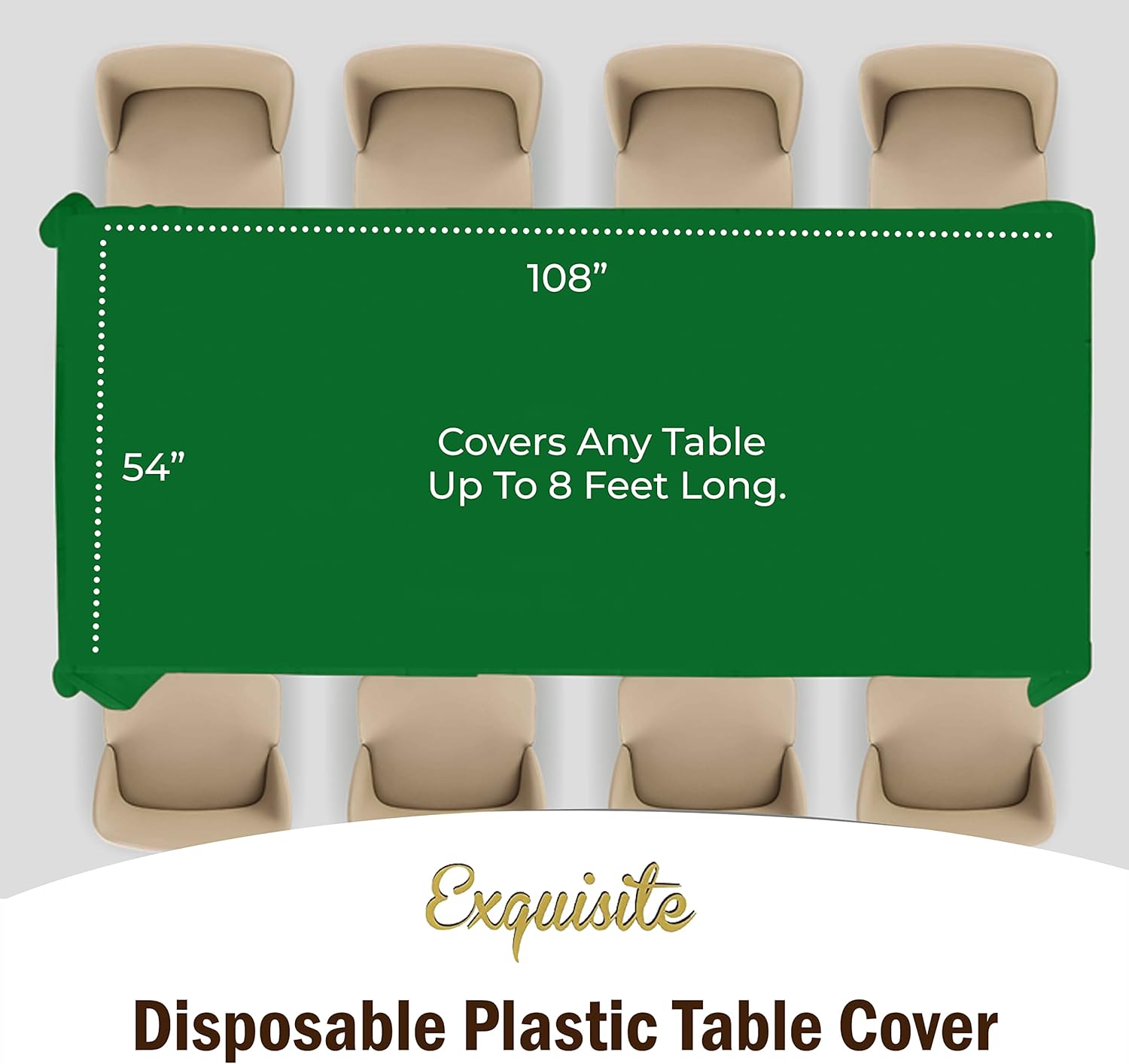 - PREMIUM QUALITY PROTECTION: This 12 pack of 54 in. x 108 in. Rectangle Emerald Green plastic tablecloths will cover any table up to 8 feet. Unlike your typical paper table clothes these disposable table covers for parties are spill and waterproof!!!