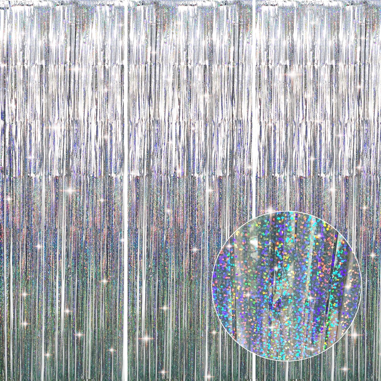 - Package Includes:3 pack shiny silver foil fringe curtains,3.2 ft x 8.2 ft each,suitable for hanging on a door or coverage a wall fully