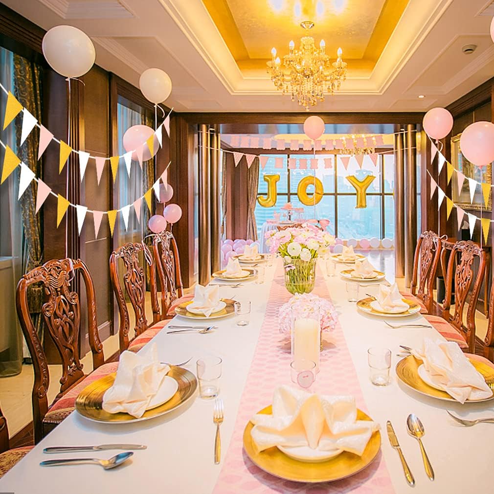 MerryNine Triangle Flag Bunting Banner, 3 Pack 30 Feet Vintage Style Pennant Banner for Wedding, Baby Shower, Event & Party Supplies 45pcs Flags (Triangle Flag - Pink White Gold Glitter)