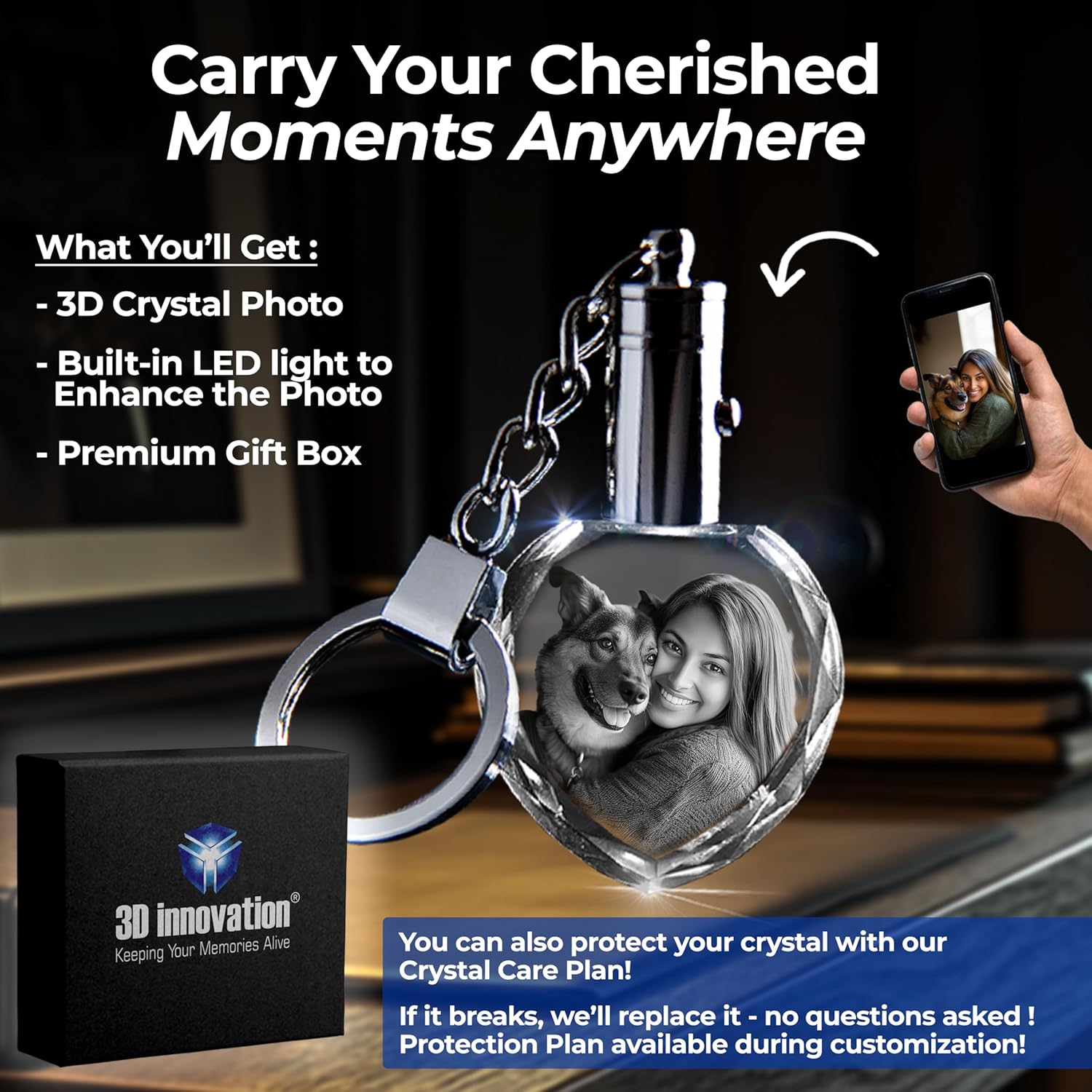 - Enhanced LED Light Feature: Each custom crystal photo keychain comes with a built-in LED light, illuminating the intricate details of your engraving with a soft glow. Simply press the button to bring your photo to life, even in low-light settings. Watch your crystal engraving come to life with a soft glow.