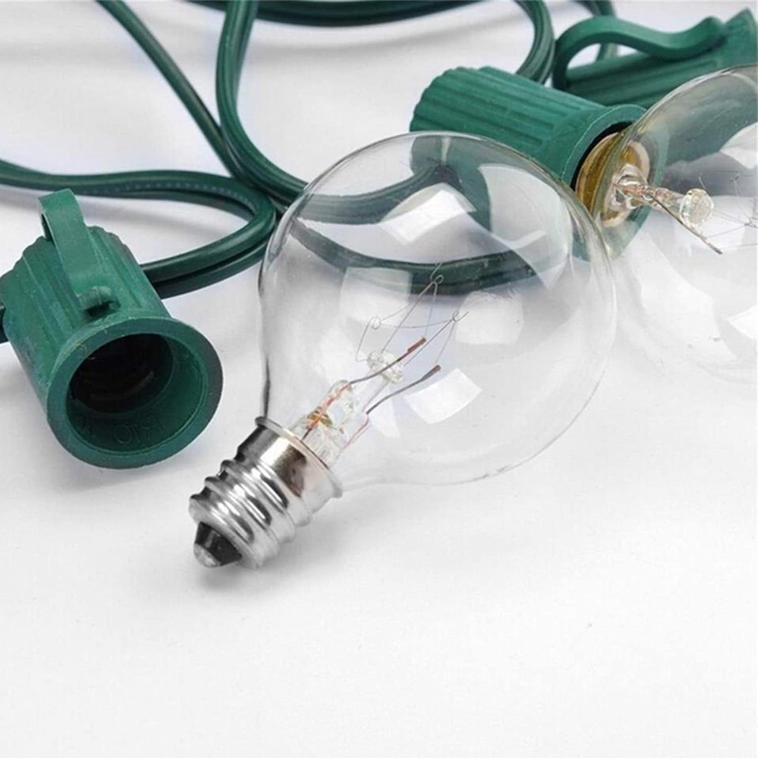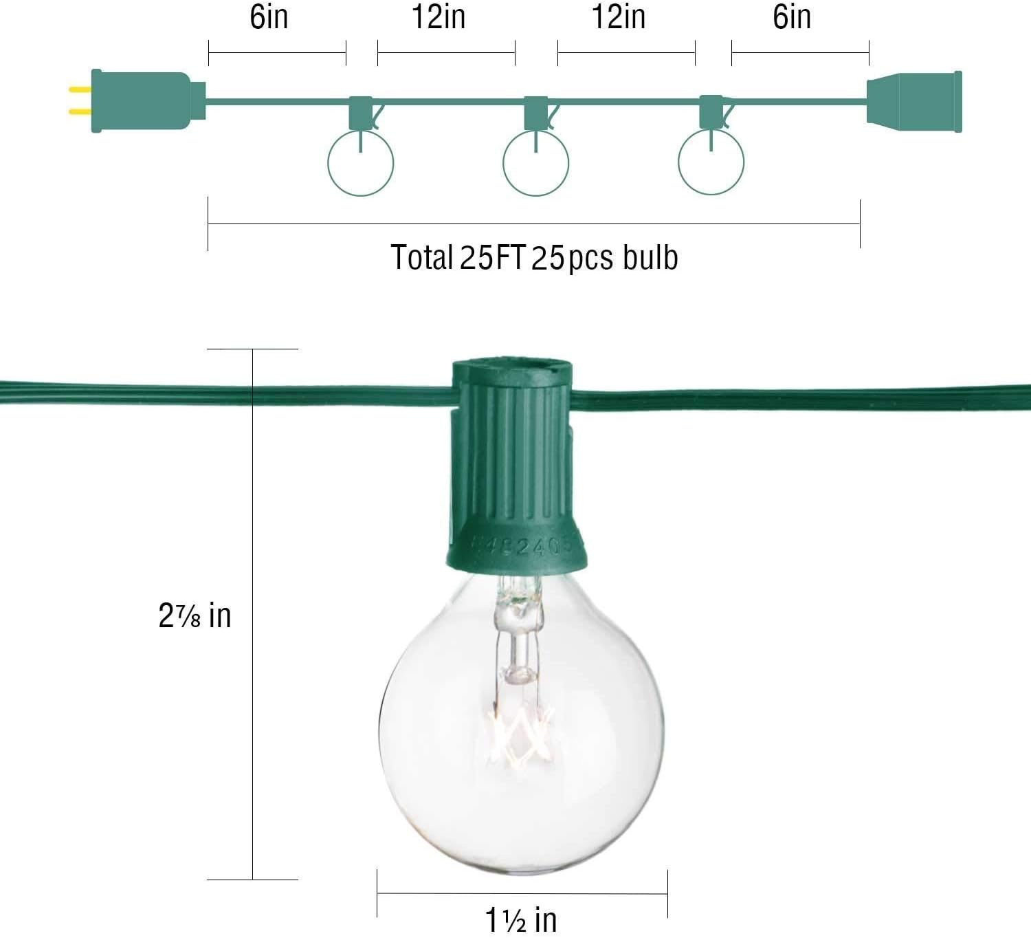 - G40 globe string lights are made of 25 feet long string used to connect 25 clear G40 Bulbs. 6β lead with male plug, 12β spacing between bulbs, 6β tail with female connector. Each strand has end to end connections, so that you will easily be able to attach up to 3 strands to cover large areas. Even with broken or removed bulbs, remaining bulbs will continue to light up