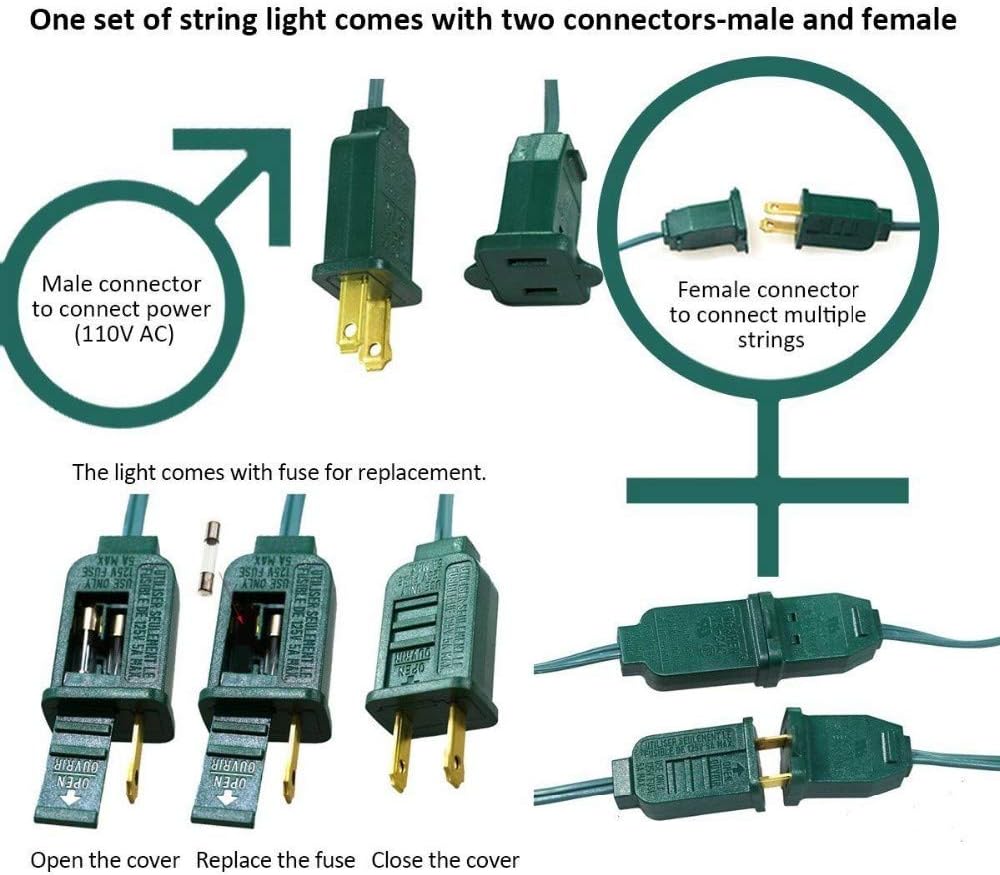 - Energy-efficient 5W bulbs, E12 candelabra base, 125W per string | 110V Power | Comes with Spare Fuse | UL Listed for general indoor/outdoor applications. Bulbs can be replaced by any Candelabra (E12) ones that single bulb not exceed 7W. Connects up to maximum 3 strands, total strand load that powered by one outlet can't exceed 432W