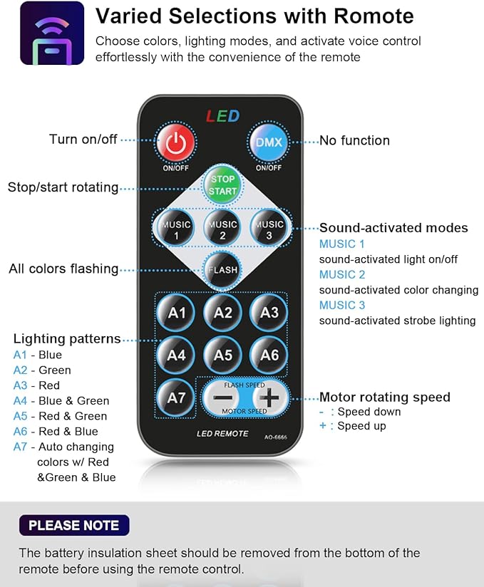 - Multifaceted Lighting Patterns: Disco lights offer 7 different lighting projection patterns. With the remote control, you can choose from red, green, blue, red + green, red + blue, green + blue, or a combination of all colors together, providing versatile and customizable lighting options for any occasion.
