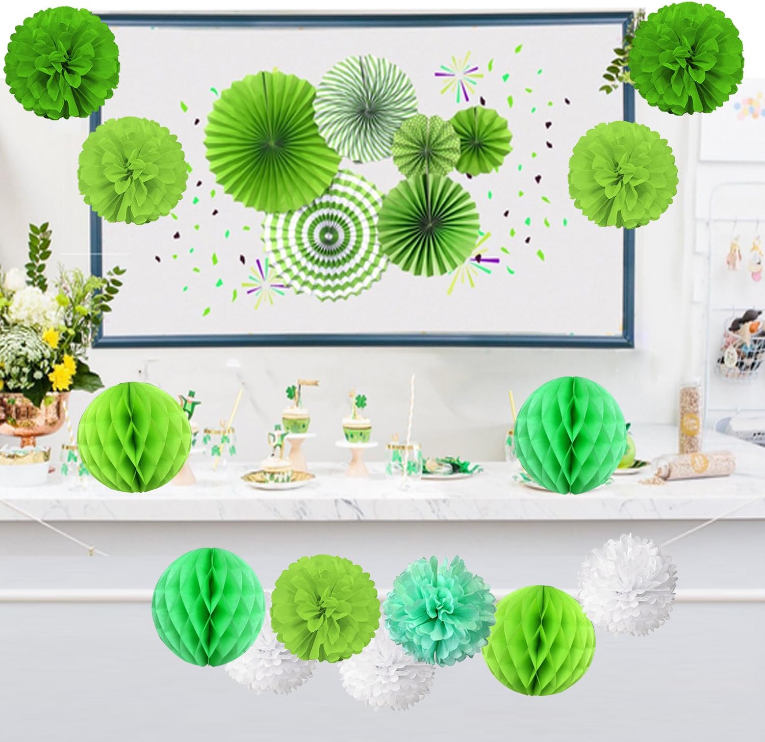 Hanging Paper Fan Set, Tissue Paper Pom Poms Flower Fan and Honeycomb Balls for Birthday Baby Shower Wedding Festival Decorations - Green