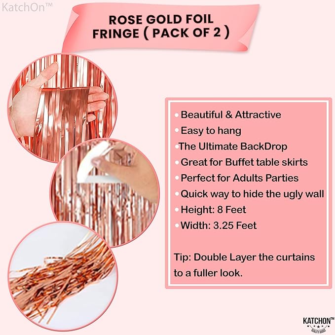 - EASY TO ASSEMBLE | ATTRACTIVE ROSE GOLD DECORATIONS FOR PARTY – Featuring a pre-applied adhesive strip, this rose gold tinsel backdrop installs seamlessly across walls, doors, and photo zones. This pack of 2 Rose Gold Foil Fringe Curtain solutions is engineered for longevity, supporting rose gold birthday decorations for women and extended-use streamers birthday decorations. The wide-cut tinsels ensure durability and maintain a polished vertical drape for events spanning Valentine’s Day decorations, Christmas decorations, and seasonal celebrations.