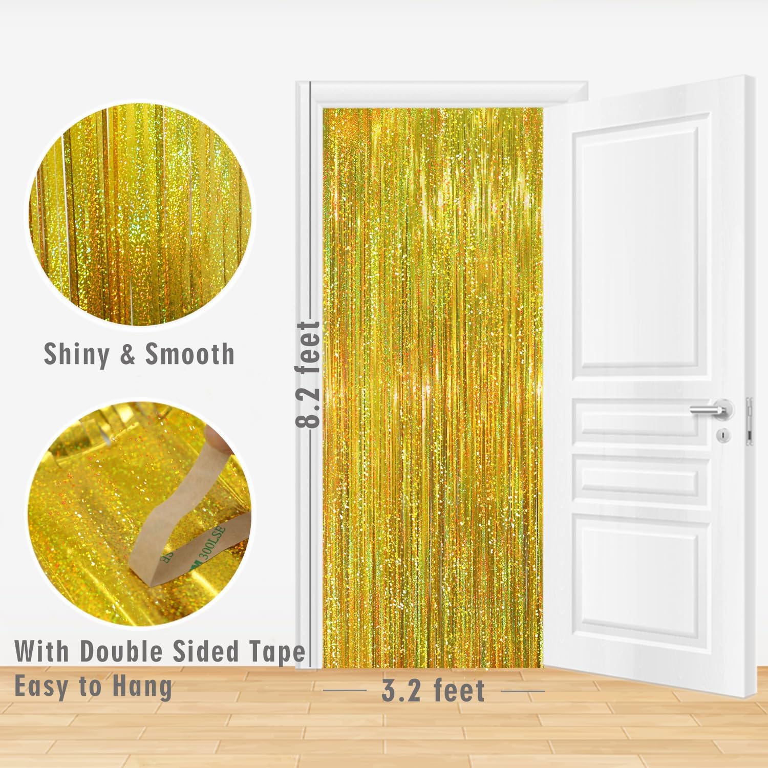 - Package Includes:1 pack shiny gold foil fringe curtain,3.2 ft x 8.2 ft each,suitable for hanging on a door or coverage a wall fully