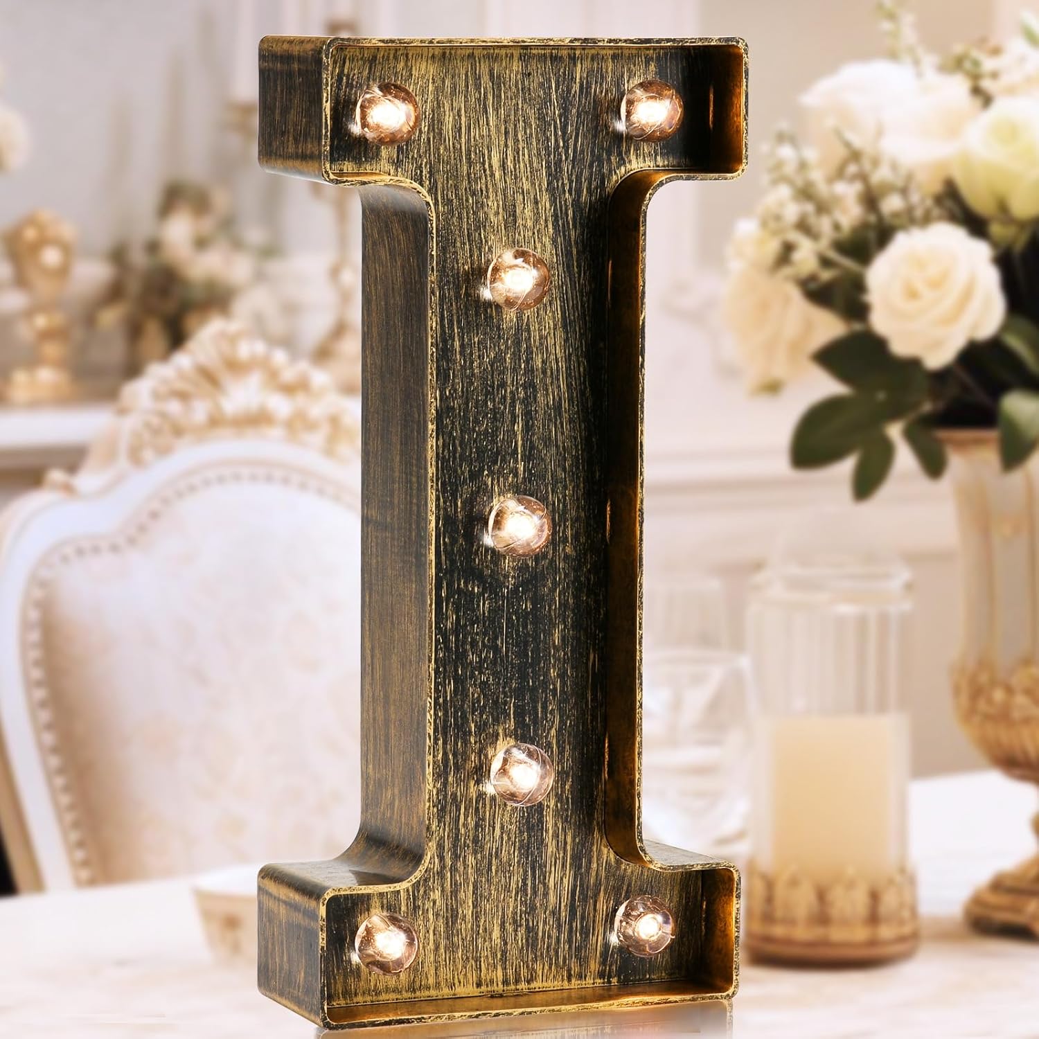 OYCBUZO Golden Black Led Marquee Letter - Industrial, Vintage Style Light Up Alphabet Letter Sign for Cafe Wedding Birthday Party Christmas Lamp Home Bar Initials Decor - I