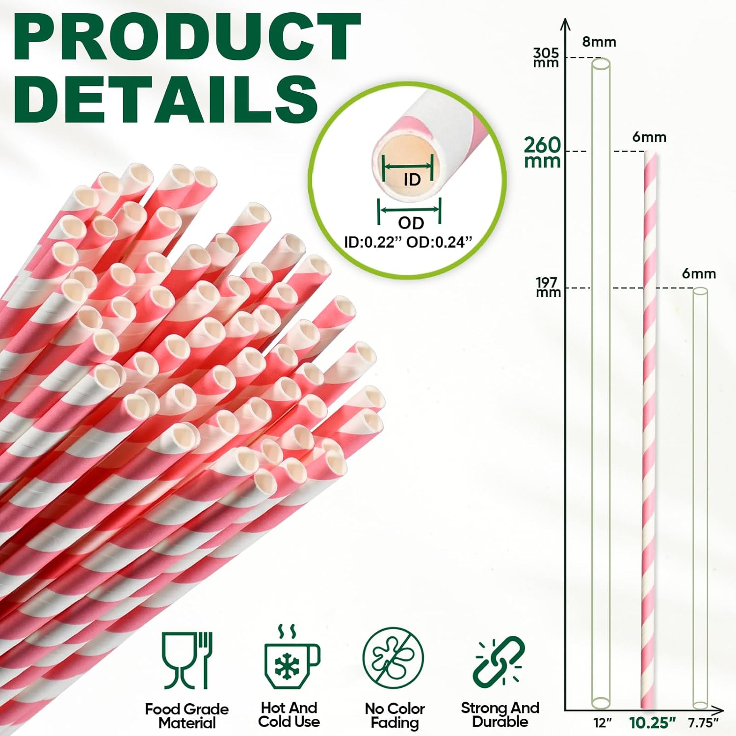 - Disposable long paper drinking straws. Measures 10.25" long, 0.24" wide (standard straw hole size)
