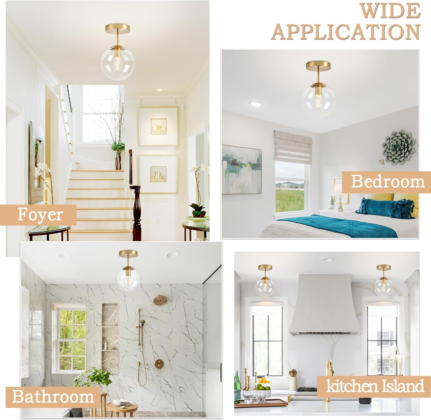 Globe Semi Flush Mount Ceiling Light, Clear Glass with Brass Finish, Contemporary Mid Century Modern Style Lighting Fixture Gold(12W 2700K LED Corn Bulb Included)