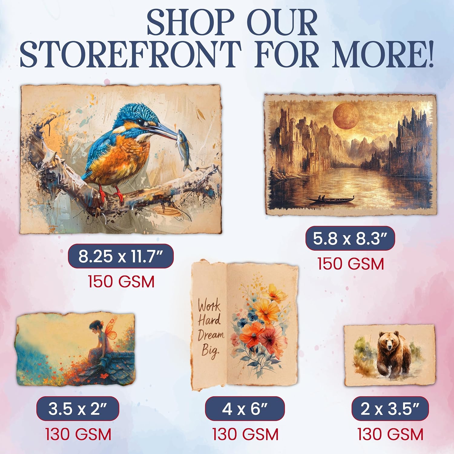 - Material : 100% recycled cotton rag fibers form the base of this eco-conscious handmade paper., 150 GSM cotton fiber paper, ideal for watercolor and fountain pen use., Artisans handcraft this paper from sun-dried cotton and natural fiber blends., Cotton-based paper with antique deckle edge crafted without chemicals or wood pulp., Crafted from acid-free cotton, ensuring durability and archival-quality preservation., Eco-friendly material includes cotton remnants upcycled from garment production., Hand-processed cotton pulp forms the foundation of this premium deckle edge paper., Handmade using raw cotton pulp, naturally dried under the sun., Made from long-fiber cotton for strength, texture, and minimal bleed-through., Natural cotton pulp is used to create a soft yet durable surface for writing and art., Natural materials like cotton and water combine in small-batch artisan production., Pure cotton base enhances ink absorption and supports multiple artistic media., Sustainably sourced cotton rags are transformed into thick, textured art paper., Tree-free cotton paper made from textile waste using traditional Indian methods. 100% recycled cotton rag fibers form the base of this eco-conscious handmade paper., 150 GSM cotton fiber paper, ideal for watercolor and foun… See more