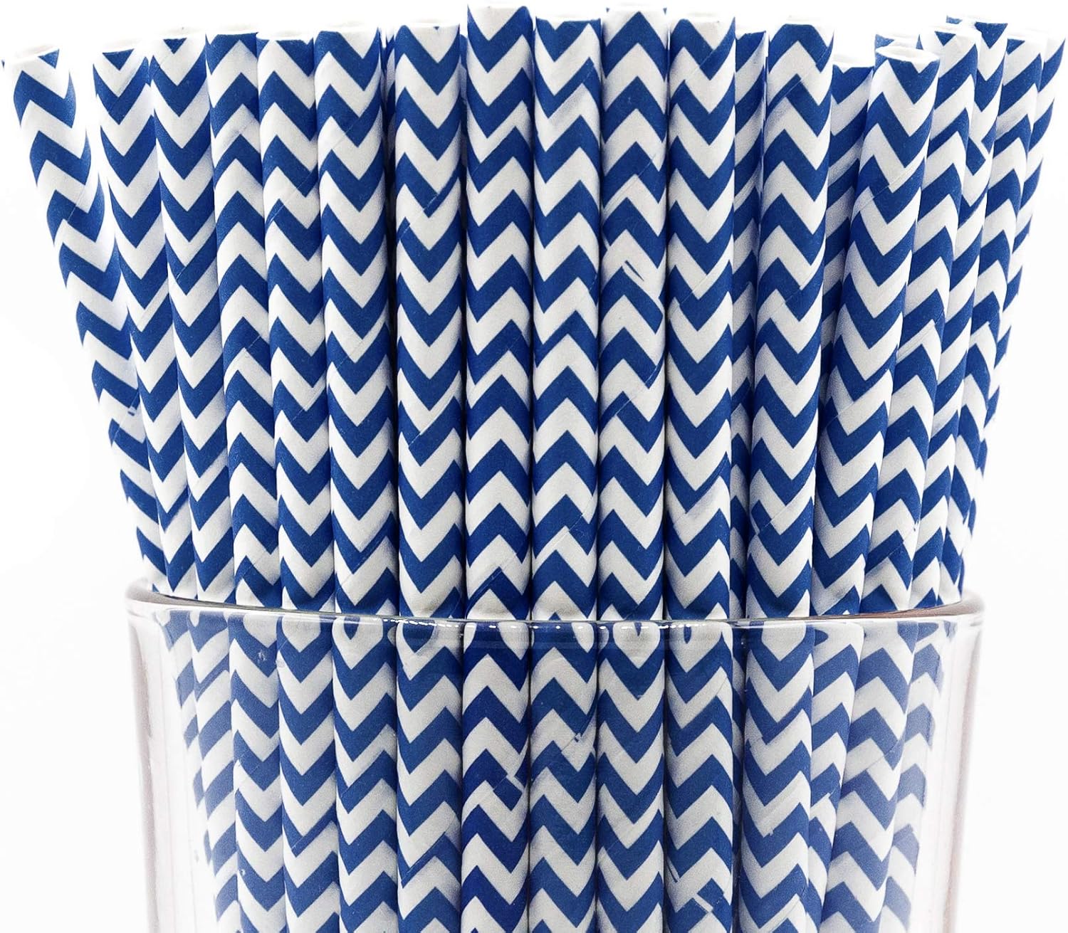 - Pack of 150 Navy Blue Chevron paper straws that are 7.75” long and have a diameter of 0.25”. Made with 4-ply paper which translates into thicker and more resilient straws that won’t wilt or change shape in both hot and cold drinks.