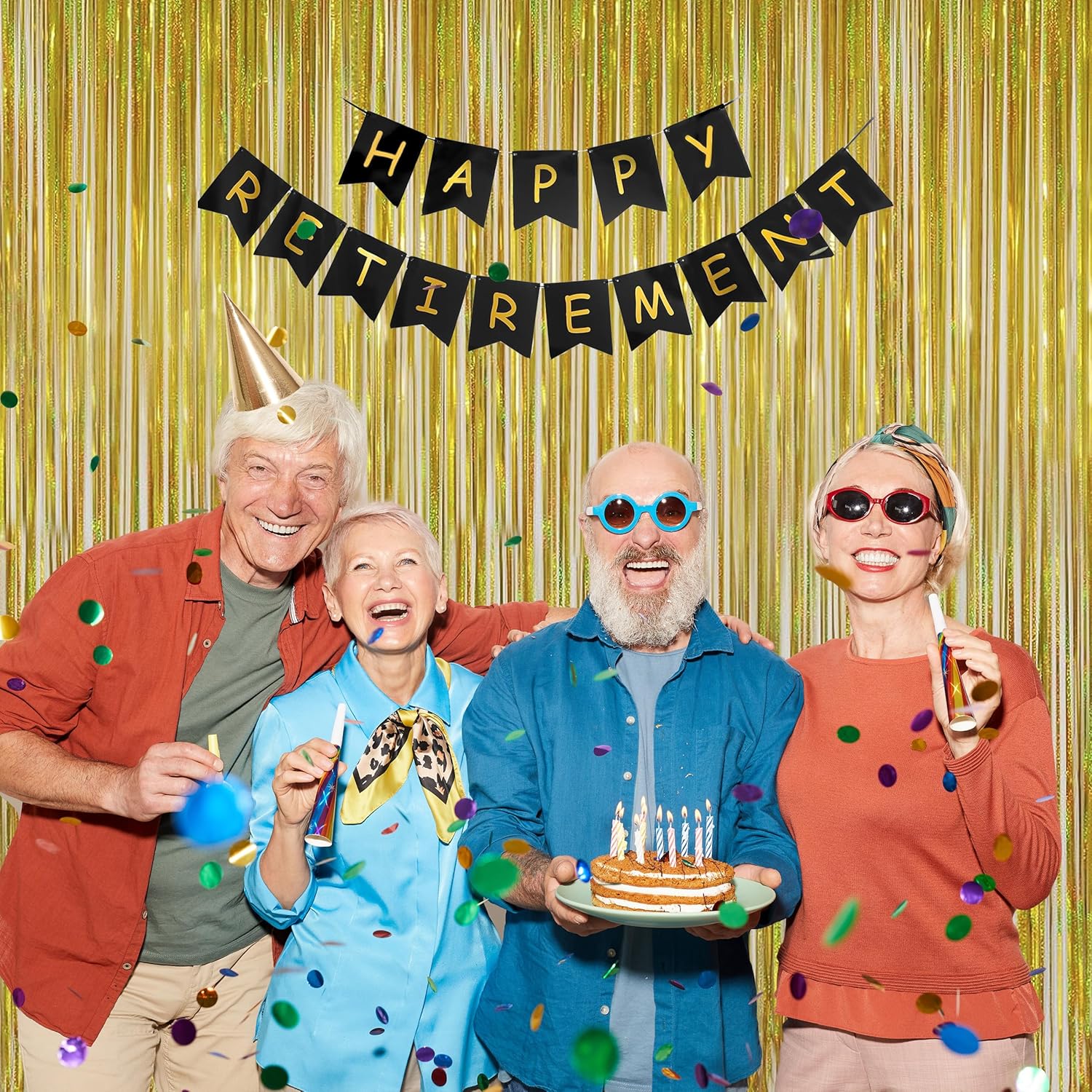 Foil Fringe Curtains Happy Retirement Decorations - Melsan 3 Pack 3.2 x 8.2 ft Gold Tinsel Curtain Party Photo Backdrop for Birthday Party Baby Shower or Graduation
