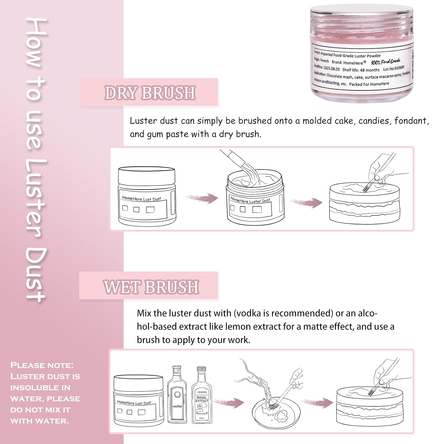 - EASY TO USE: Add edible dust directly to the surface being decorated, or use the luster of edible dust with alcohol (vodka is recommended) or an alcohol-based extract like lemon extract for a matte effect. It only takes a few drops and mixes until the luster dust has the consistency of paint. You can also DIY all kinds of shiny drinks, just add a little edible shine to your drink and you will have a glamorous cocktail, champagne, or any drink that everyone exclaims for you!