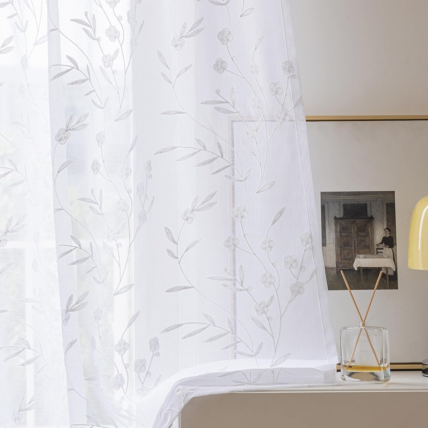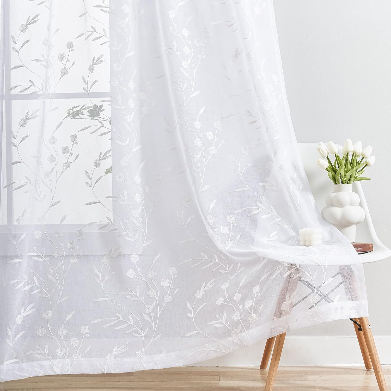 Sheer Curtains White 45 Inches Long Floral Embroidery Rod Pocket Voile Drapes for Living room, Bedroom, Window Treatments Semi Lace Outdoor Curtain Panels for Yard, Kitchen, Villa, Set of 2, 52"x 45".