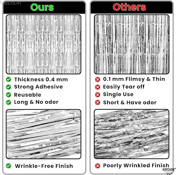 - STURDY AND DURABLE | REUSABLE: This reusable silver tinsel backdrop adds sparkle to disco backdrop for parties using premium materials to add a pop of color and sparkle to your disco backdrop for parties. It's durable and budget-friendly, Ideal for birthdays, anniversary, baby showers, bachelorette party, wall décor, silver tinsel curtain, silver party streamers and seasonal setups. Wide-cut design prevents tearing and ensures easy storage for long-term use use later in engagement party decorations, bridal shower, bachelorette party decorations , silver birthday decorations