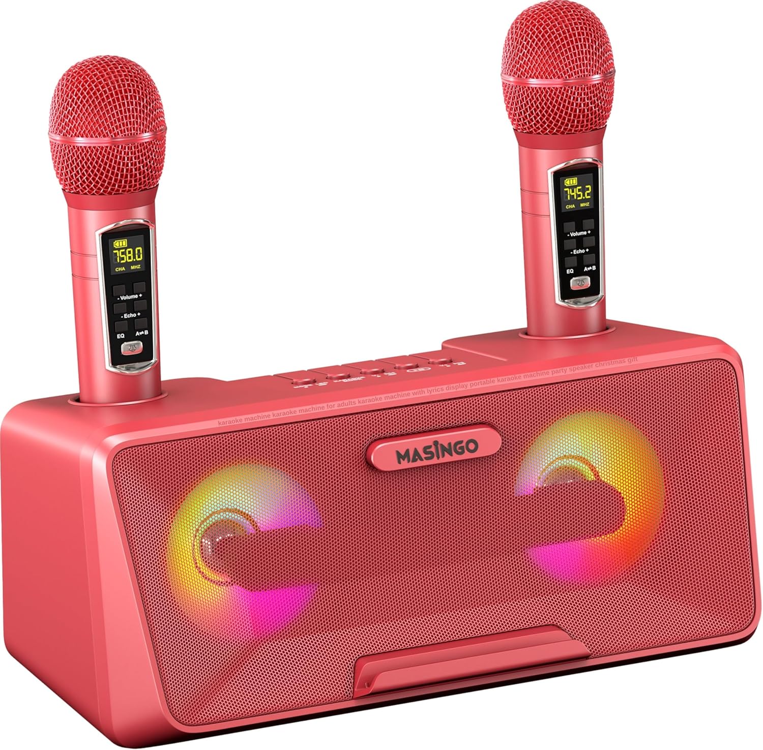 MASINGO Karaoke Machine for Adults and Kids with 2 Wireless Microphones, Portable Bluetooth Singing Speaker, Colorful LED Lights, PA System, Lyrics Display Phone Holder, and TV Cable. Presto G2 Pink