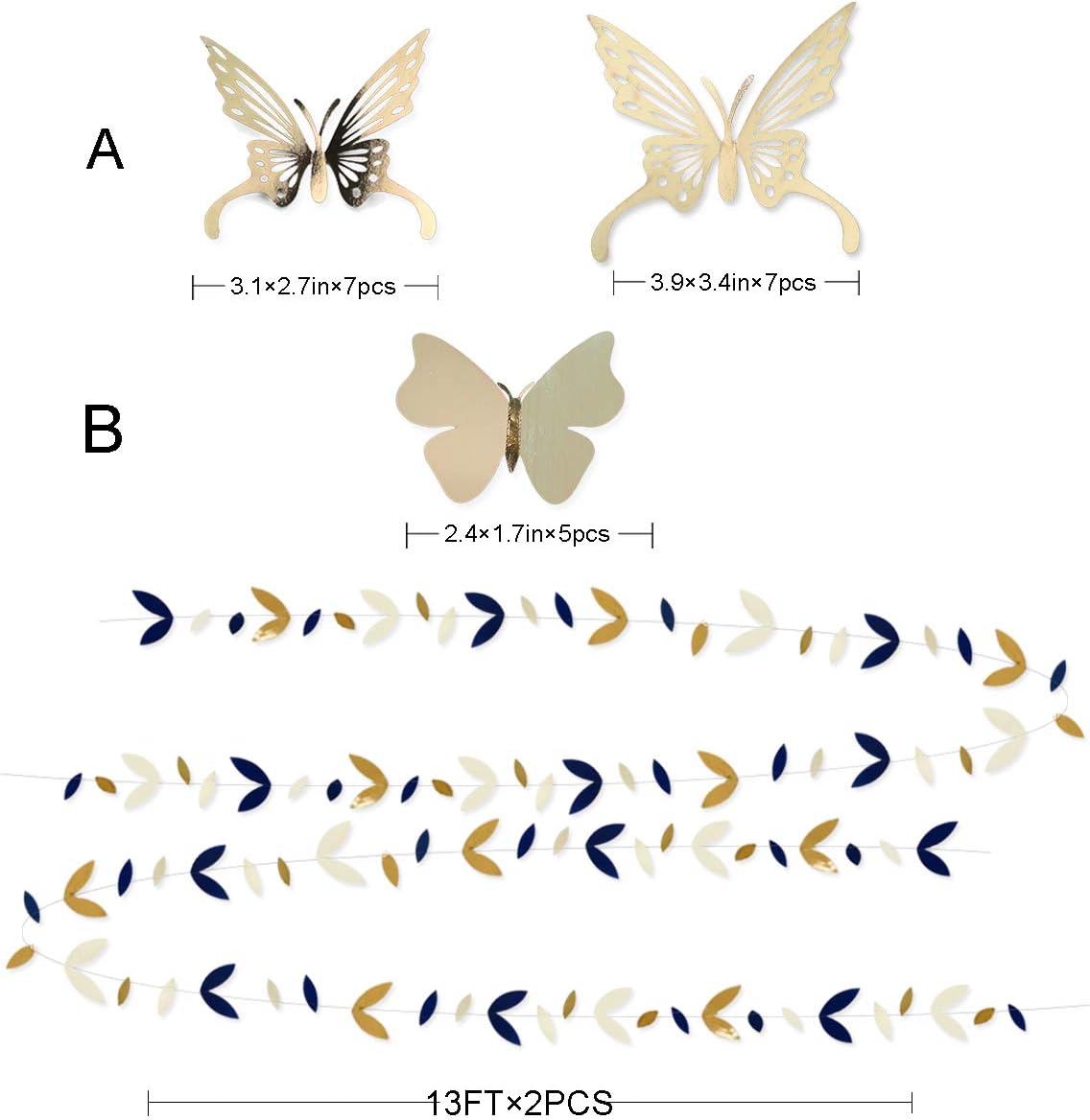 - Package Contains - 2×blue gold leaves garlands,8×paper flowers pom poms,3×paper lanterns,24×champagne gold butterfly decals stickers,3×royal blue ribbon.Total 40 pcs.