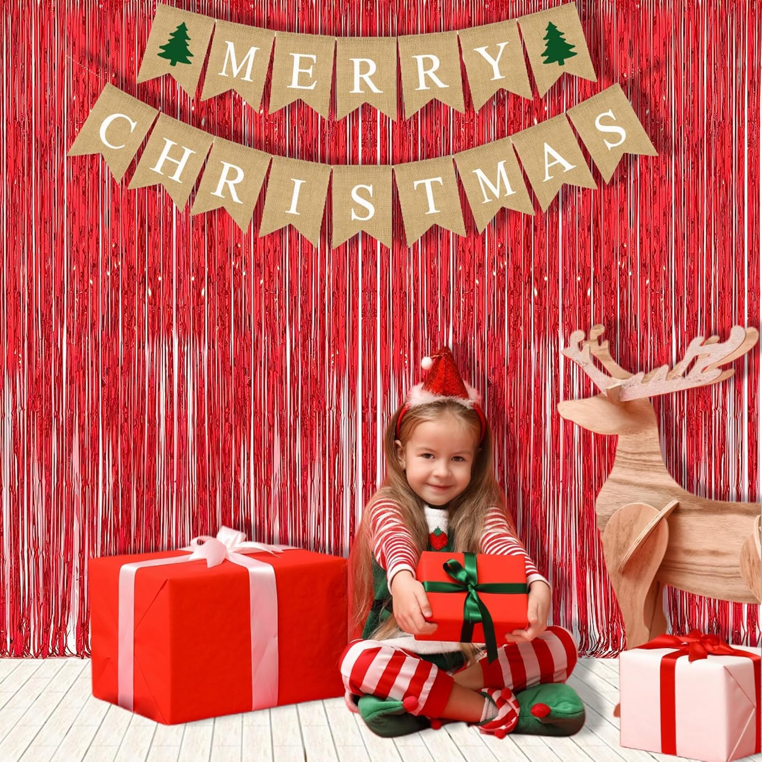 Foil Fringe Curtain Christmas Party Decorations - Red Metallic Tinsel Photo Booth Backdrop Party Steamers Curtains for Christmas New Years Valentines Engagement Celebration Party