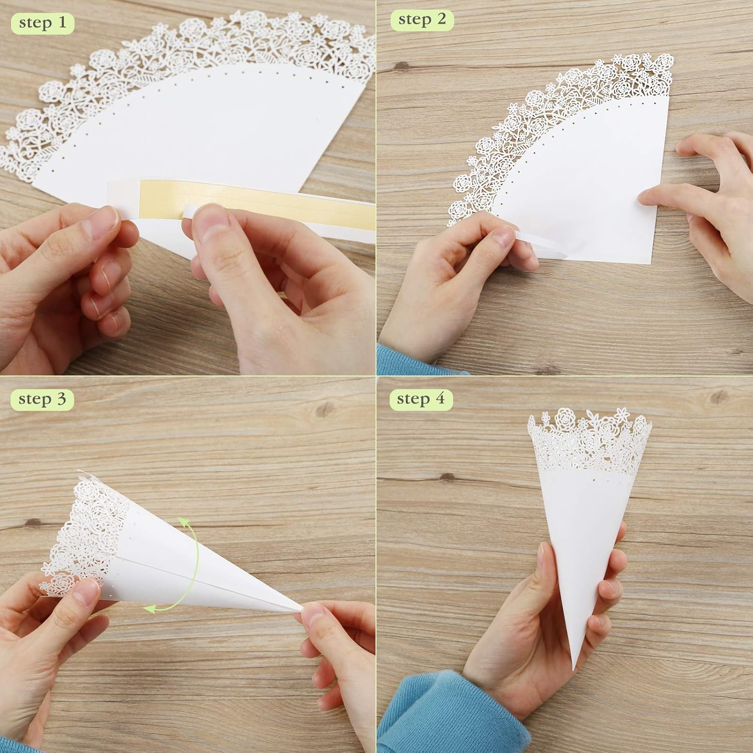 - With adhesive taps attached, no staples are needed in the making of these cones