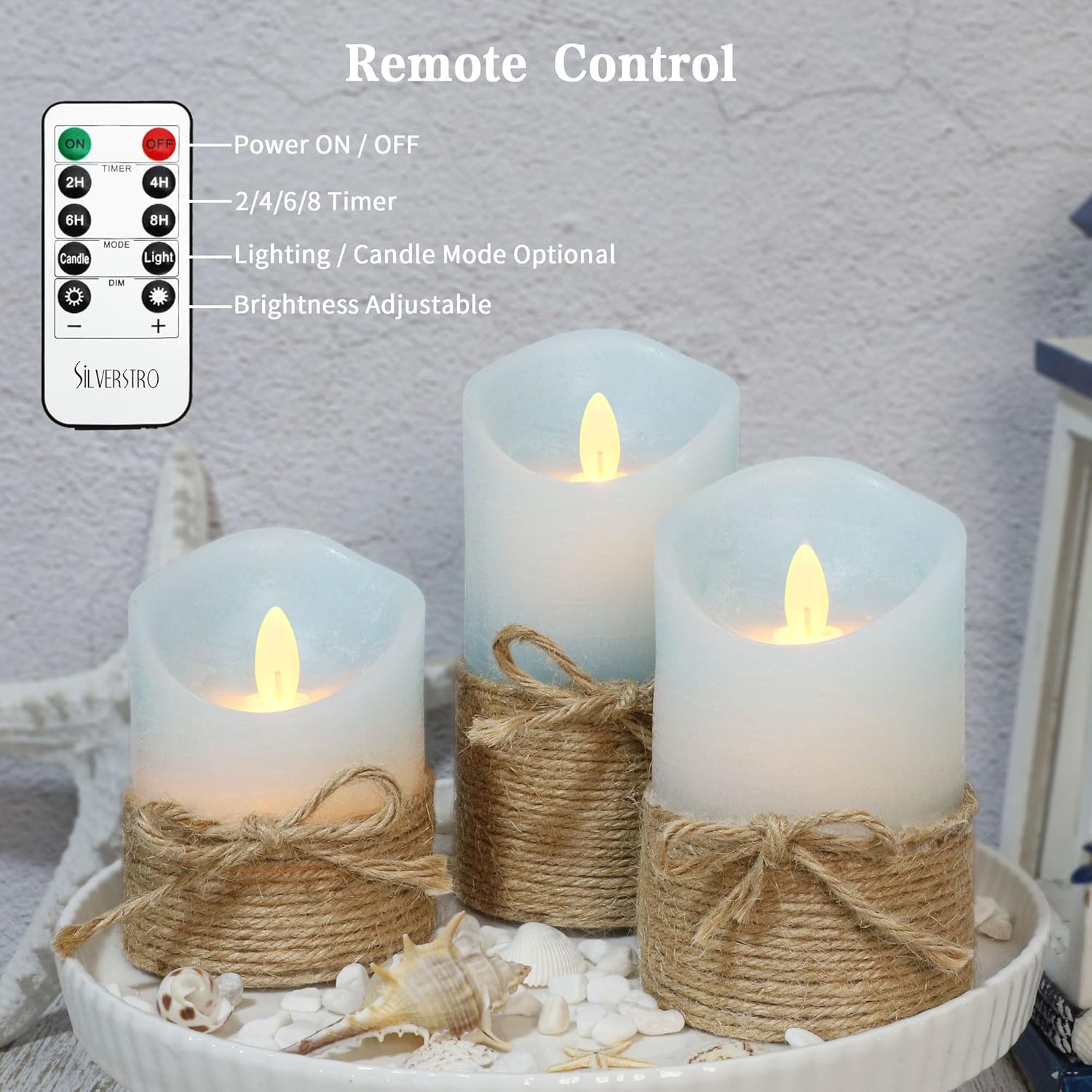 Silverstro Nautical Decor Ocean Blue Flameless Candles - Home Christmas Farmhouse Summer Decorations - Set of 3 (D3.11 X H4 5" 6")