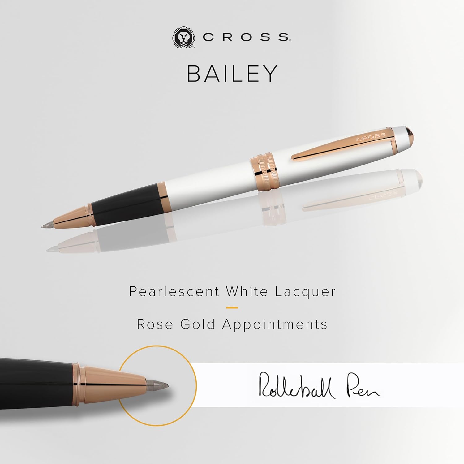 Cross Bailey Refillable Rollerball Pen Presented in a Premium Gift Box - Medium Point, Black Ink, White & Rose Gold