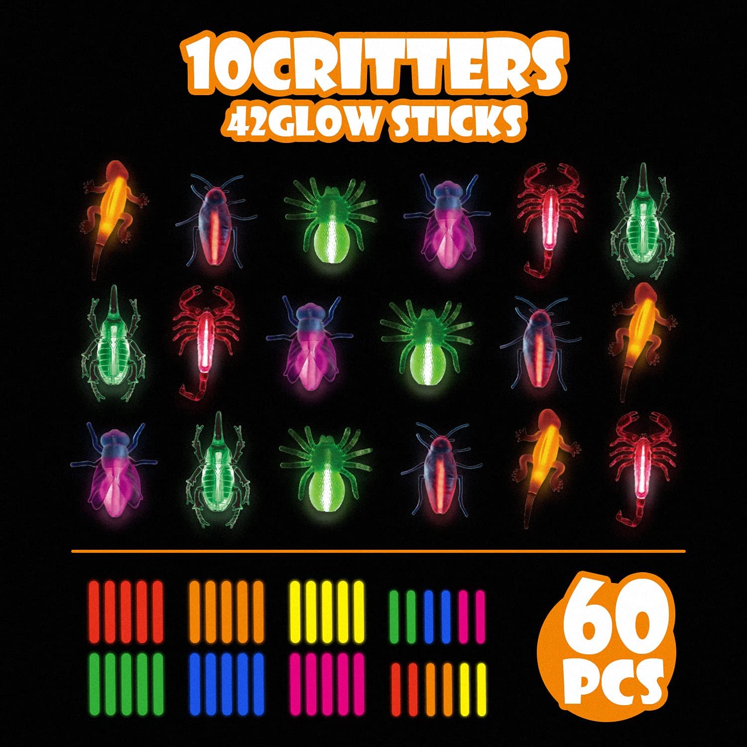 - Glow in the Dark Halloween party favors-There are 18pcs glow gritters in our glow in the dark party set ,6 different kinds,3pcs for each kind.42 glow sticks in 6 colors for the Critters.Also come with 18 bonus decoration strings.Easy to Active. Fun and safety. Glows for Hours.Replaceable Glow Sticks.
