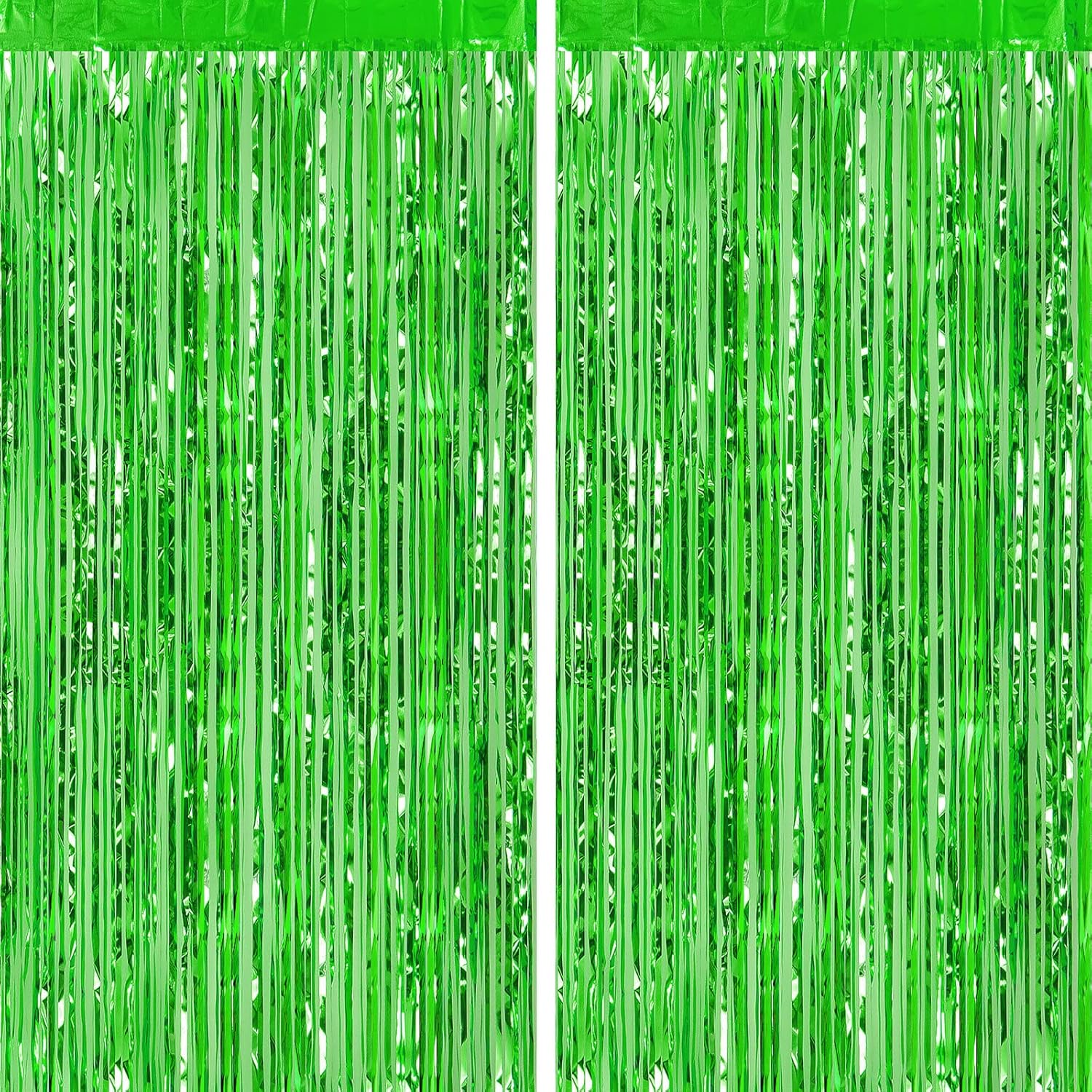 CHRORINE 2pcs 3ft x 8.3ft Green Tinsel Foil Fringe Curtains Streamers Backdrop for Green Birthday Jungle Safari Tropical Party Christmas Decorations