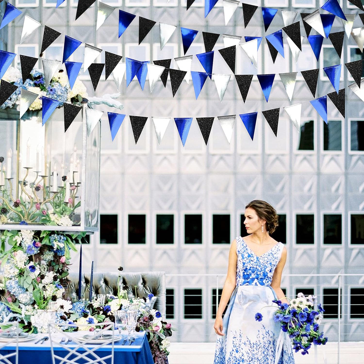 - 💙PACKAGE CONTAINS- 3 set of royal blue black silver hanging triangle party banner,each string is 3 meters with 26 pieces triangular flags,so total is 9 meters = 30 feet and 78 pieces flags. Size of each flag:14cm x 9cm/5.5" x 3.5" (L x W).