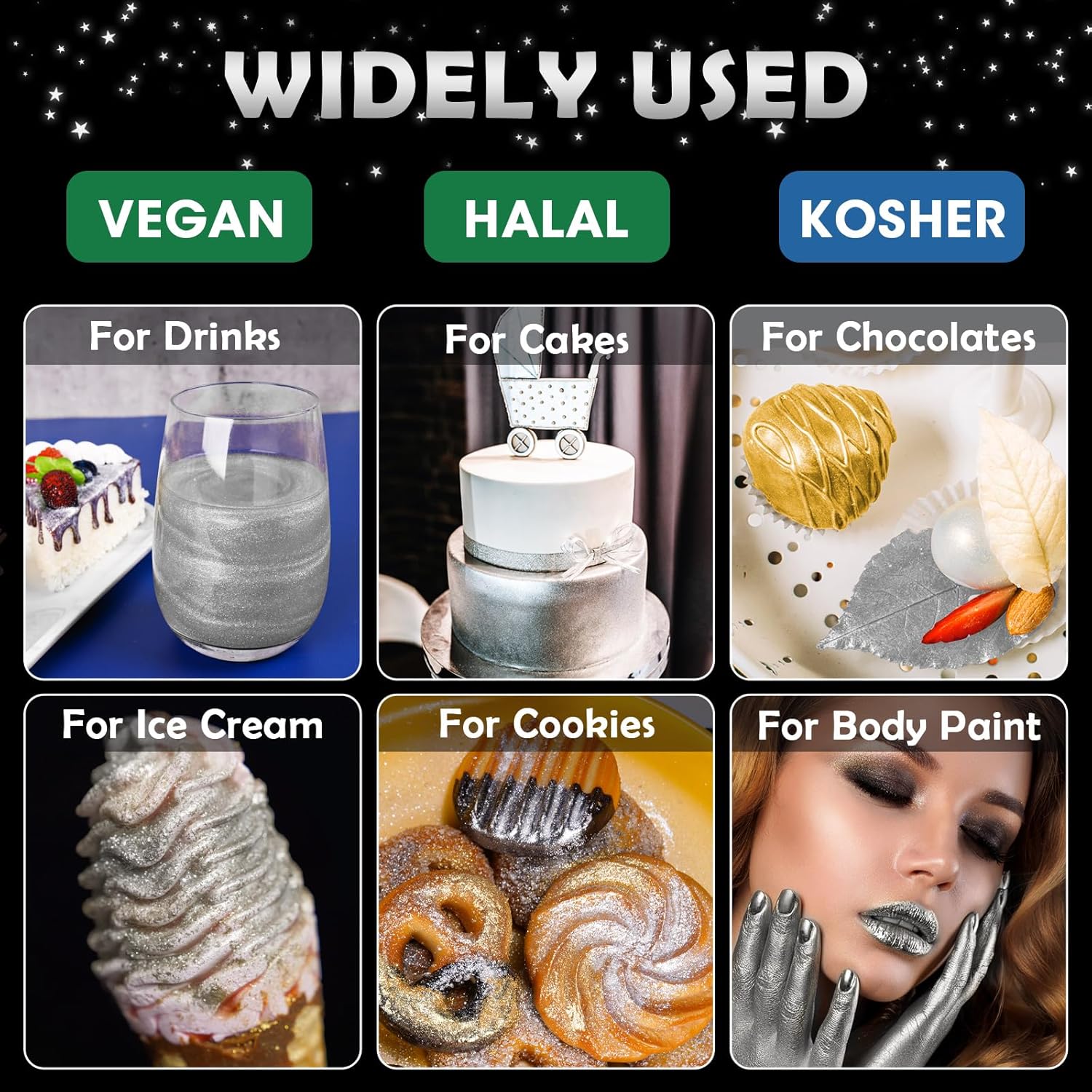 - ✔️【Vegan & Allergen-Free】Food-grade glitter uses only the highest quality vegan ingredients and does not contain common food allergens, including gluten, nuts or dairy products, so everyone can use and enjoy this product regardless of diet or food allergies. Unlike food contact glitter, these are 100% edible, so you don't need to worry about using them in your creations to make them sparkle for all.