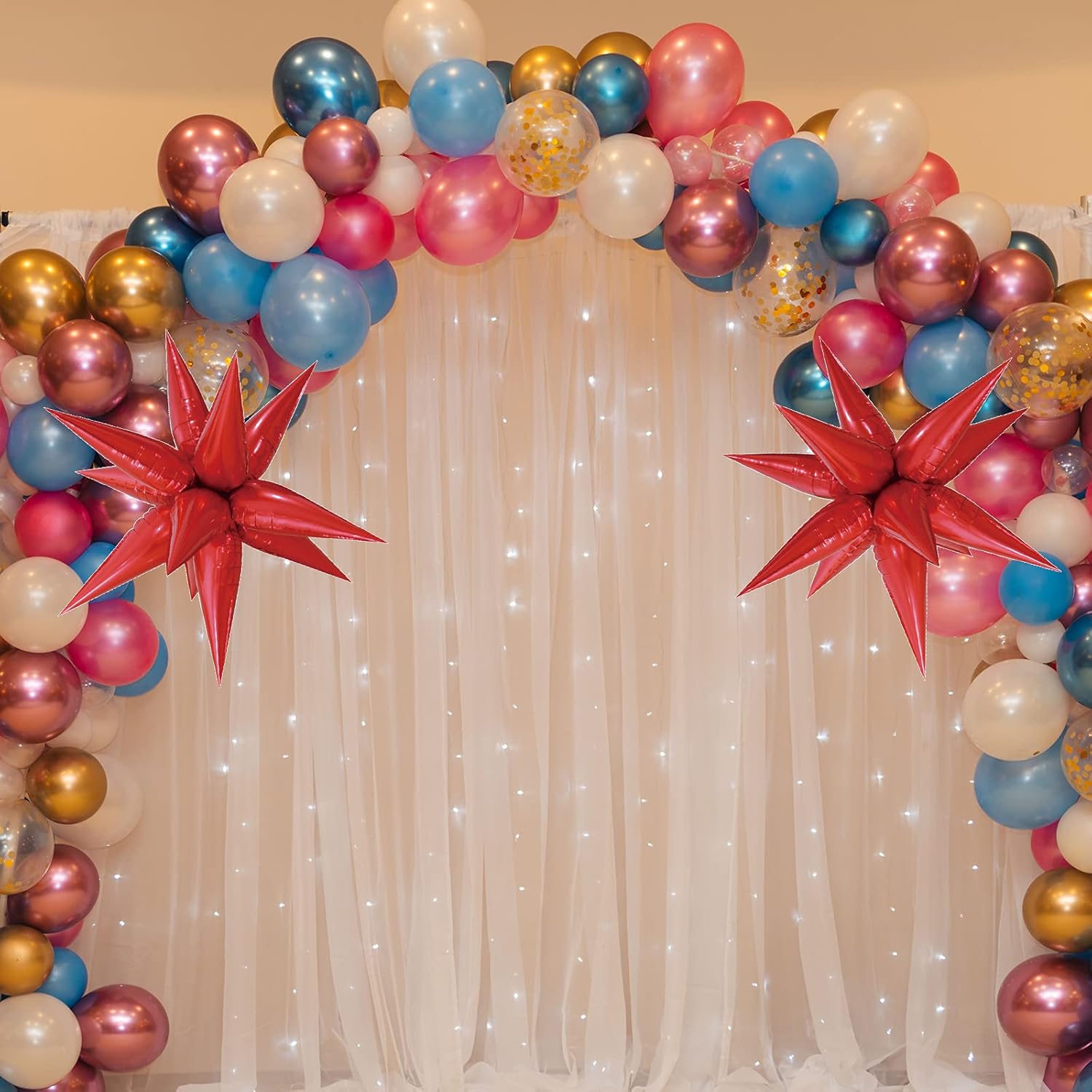 - Star Balloons, Item included 24 pcs drop-balloon, assemble 12pcs drop-balloon into a Star-burst balloon, total 2pcs Starburst balloon
