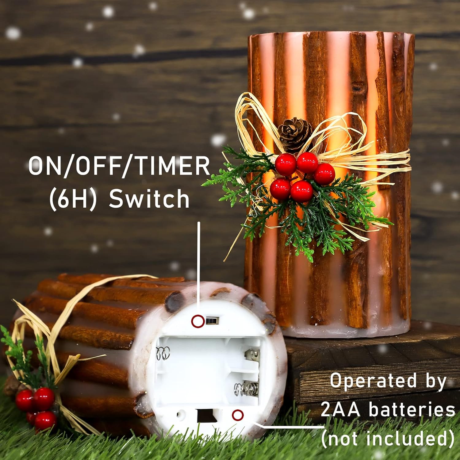 Silverstro Christmas Fake Candles with Remote Embedded Cinnamon Bark Blinks Real Wax Decorative Candles for Home Party Xmas Holiday Decorations - D3.23 X H6 Set of 2