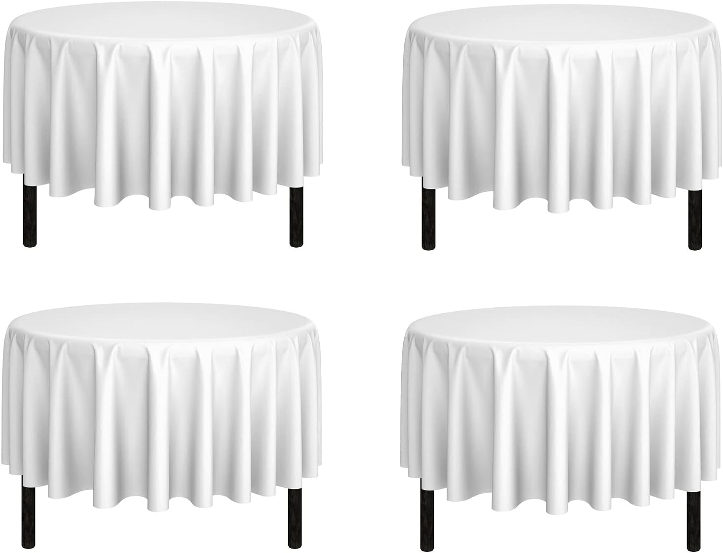 Pomp White 90" Inch Round Premium Polyester Tablecloth (4 Pack) | Wrinkle + Stain Resistant Easy Care Fabric | Fits Round or Circle Table