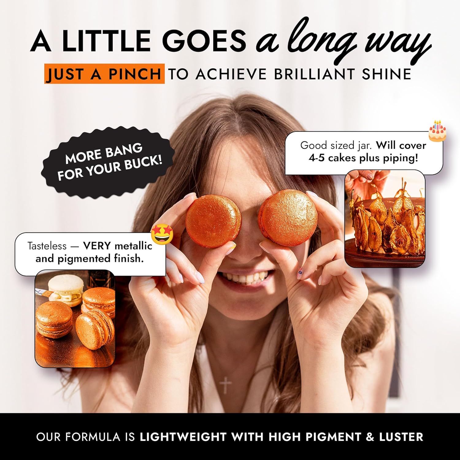 - EASY TO USE: Our orange luster dust is incredibly versatile. Apply with a wet brush, airbrush, or dry brush, and even mix into beverages. Achieve professional-looking results effortlessly at home, whether decorating halloween cakes or adding shimmer to cocktails.