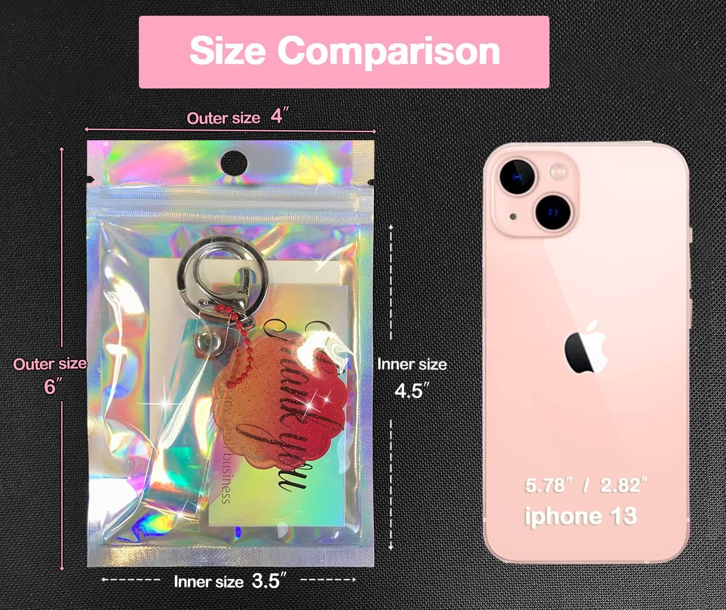 - Attention for Size - Please make sure you choose the RIGHT size before placing the order. There're photo & description about the size. Please pay attention to inner size of the baggies. You will get totally 100 Pcs 4x6 inches holographic packaging bags.