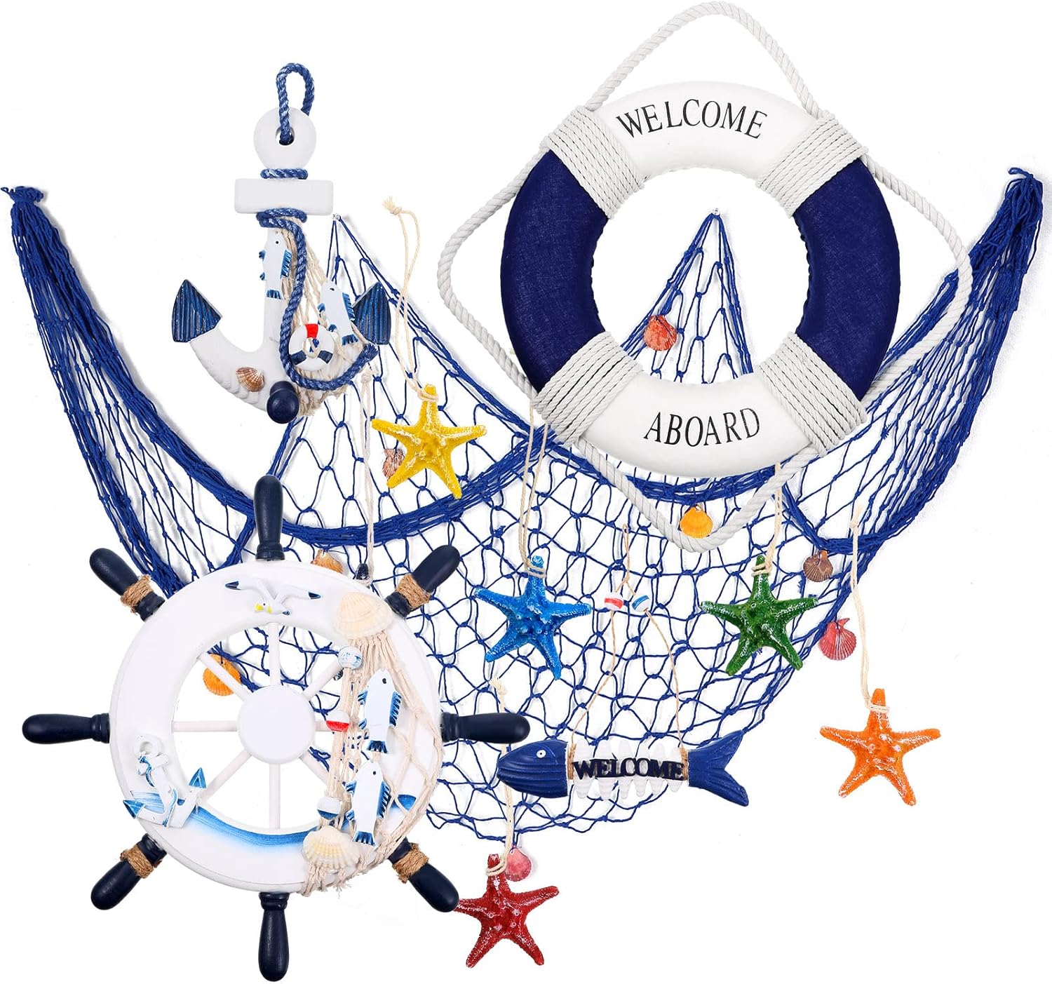 Marsui 11 Pcs Wooden Nautical Wall Decor Fishing Net Decorations, Include Decorative Fishing Net, Ship Wheel, Fish Skeleton, Life Ring, Anchor, Starfish Beach Decor for Mediterranean Party (Blue)