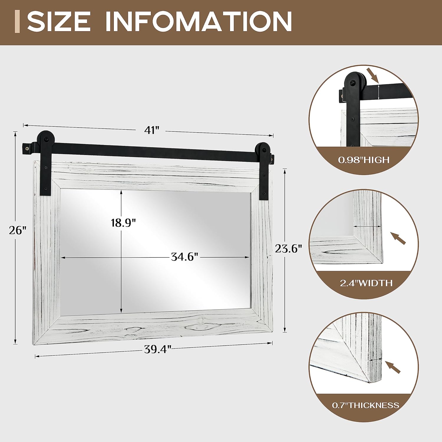 - EASY TO INSTALL: The overall size of this rustic mirror is 40.9 x 26 x 0.67 inch, and the display size of the mirror is 34.6 x 18.9 inch. The track is 41 inch. You can fix the pulleys to the mirror first, then mount the track on the wall and finally snap the pulleys onto the track to complete the hanging