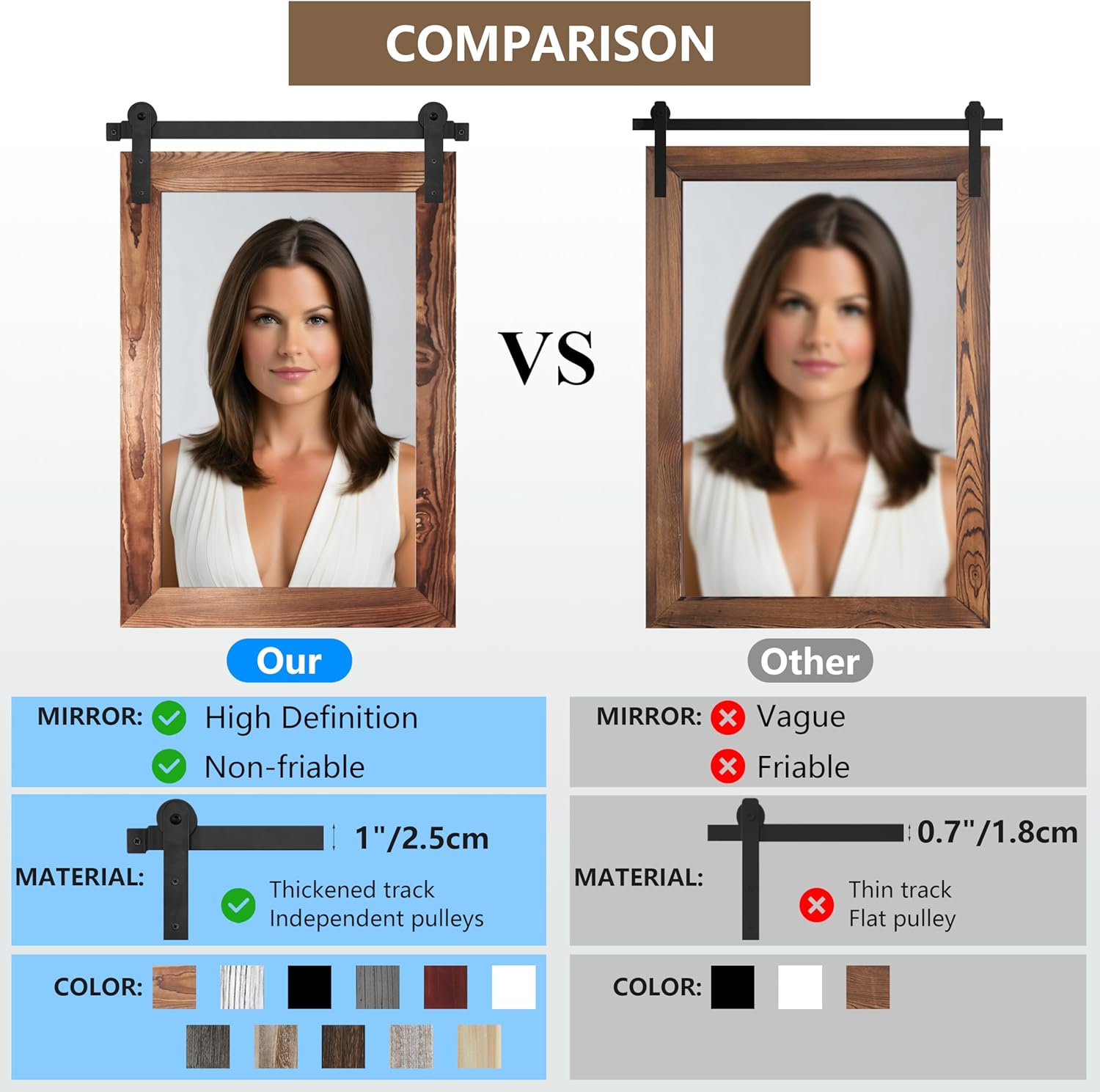 - QUALITY MATERIALS: The frame of the barn mirror consists of an antique solid wood frame and a sturdy metal bracket. The interior features a 4mm HD silver mirror with clear and distortion-free reflections, providing a better sense of light and projection in your space