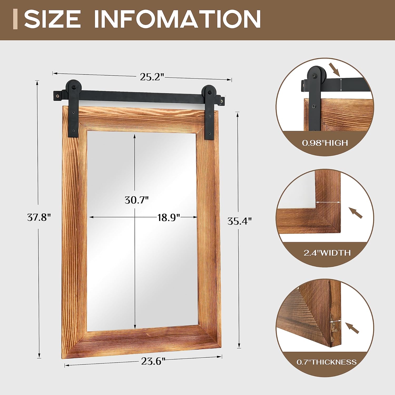 - EASY TO INSTALL: The overall size of this rustic mirror is 37.8 x 25.2 x 0.67 inch, and the display size of the mirror is 30.7 x 18.9 inch. The track is 25.2 inch. You can fix the pulleys to the mirror first, then mount the track on the wall and finally snap the pulleys onto the track to complete the hanging