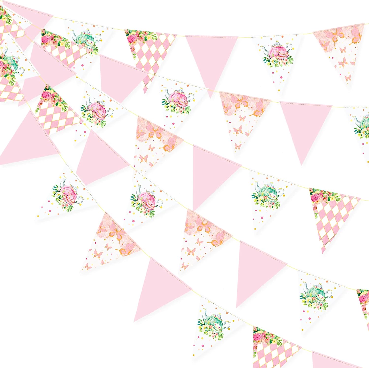 - 🌺PACKAGE CONTAINS- 3 set of tea party spring hanging triangle party banner,each string is 3.6 meters/11.8 ft with 20 pieces triangular flags,so total is 10.8 meters = 35.4 feet and 60 pieces flags. Size of each flag:14cm x 16.3cm/5.5" x 6.4" (L x W).