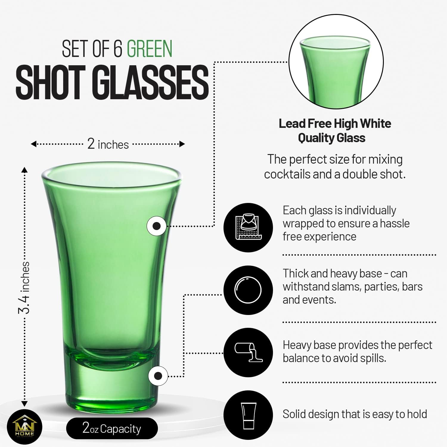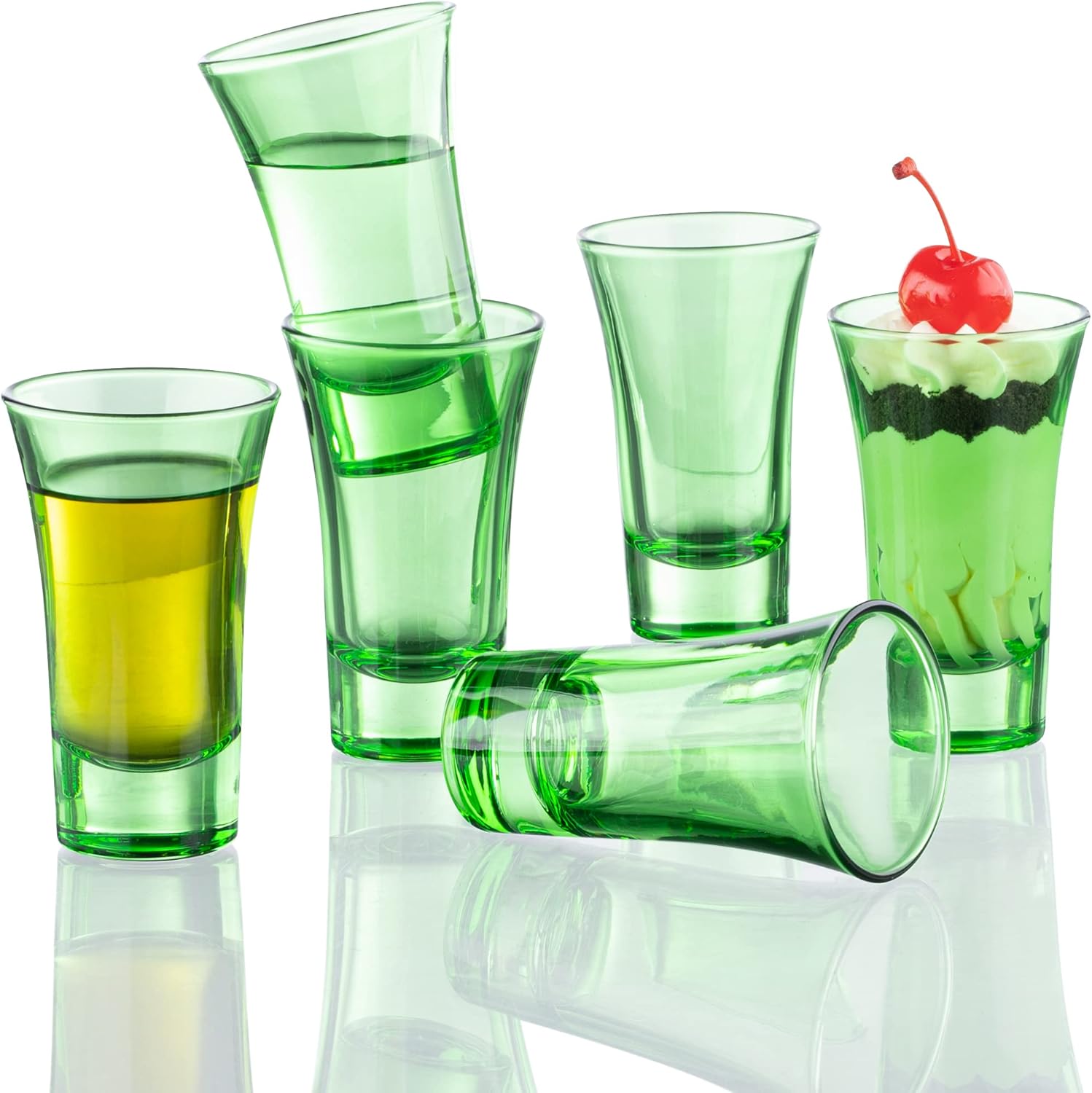 - Green Shot Glasses- Set of 6 fully colored green shot glasses. 2 Oz capacity shot glass, the perfect size for mixing cocktailsand a double shot. 3.4" High x 2" Diameter. Solid seamless design that is easy to hold and drink from. Each glass is individually wrapped to ensure a hassle free experience.