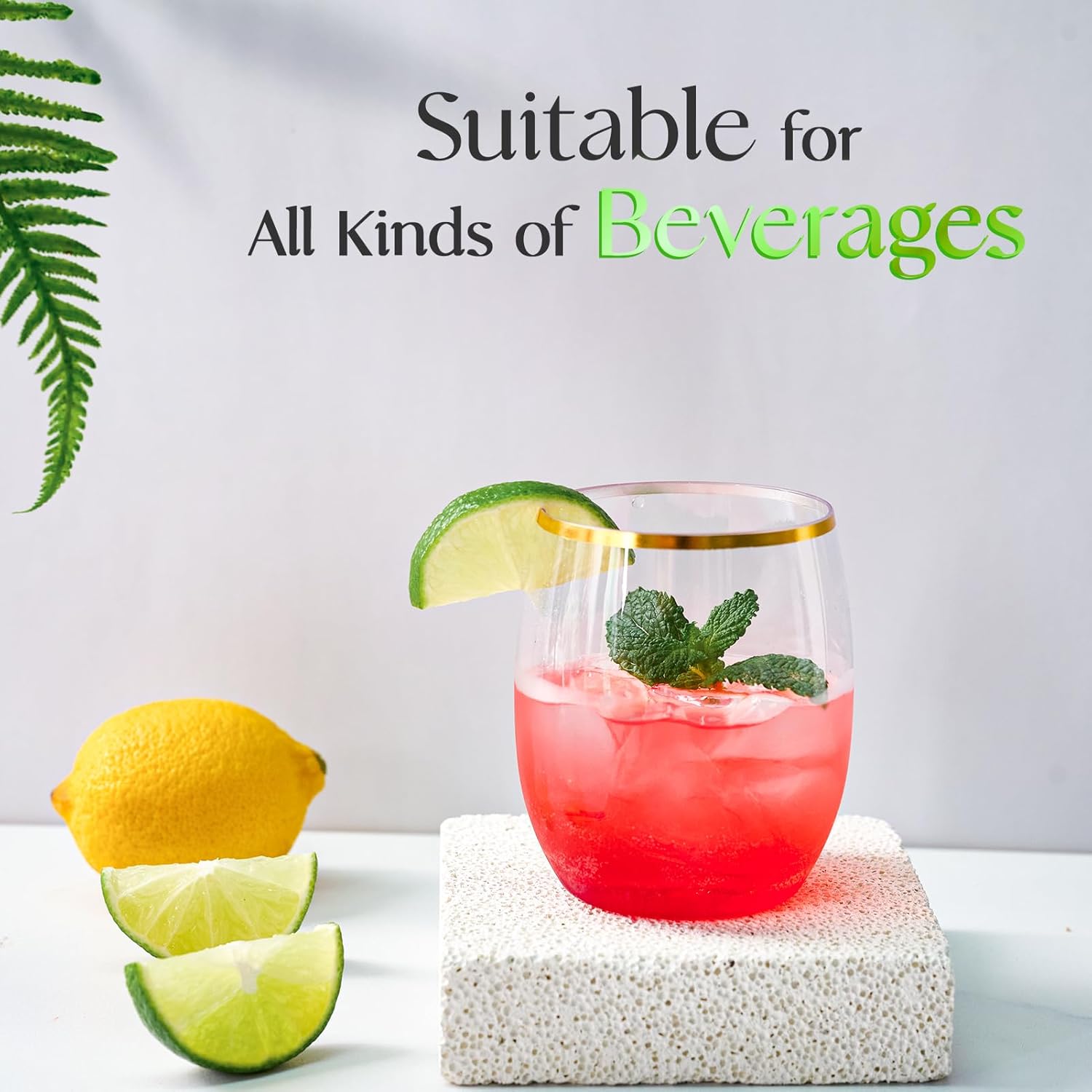 - The package includes 32 packs of 12 oz stemless gold rim plastic wine glasses, premium disposable wine glasses to save you time and effort and enjoy your event without having to worry about post party chaos