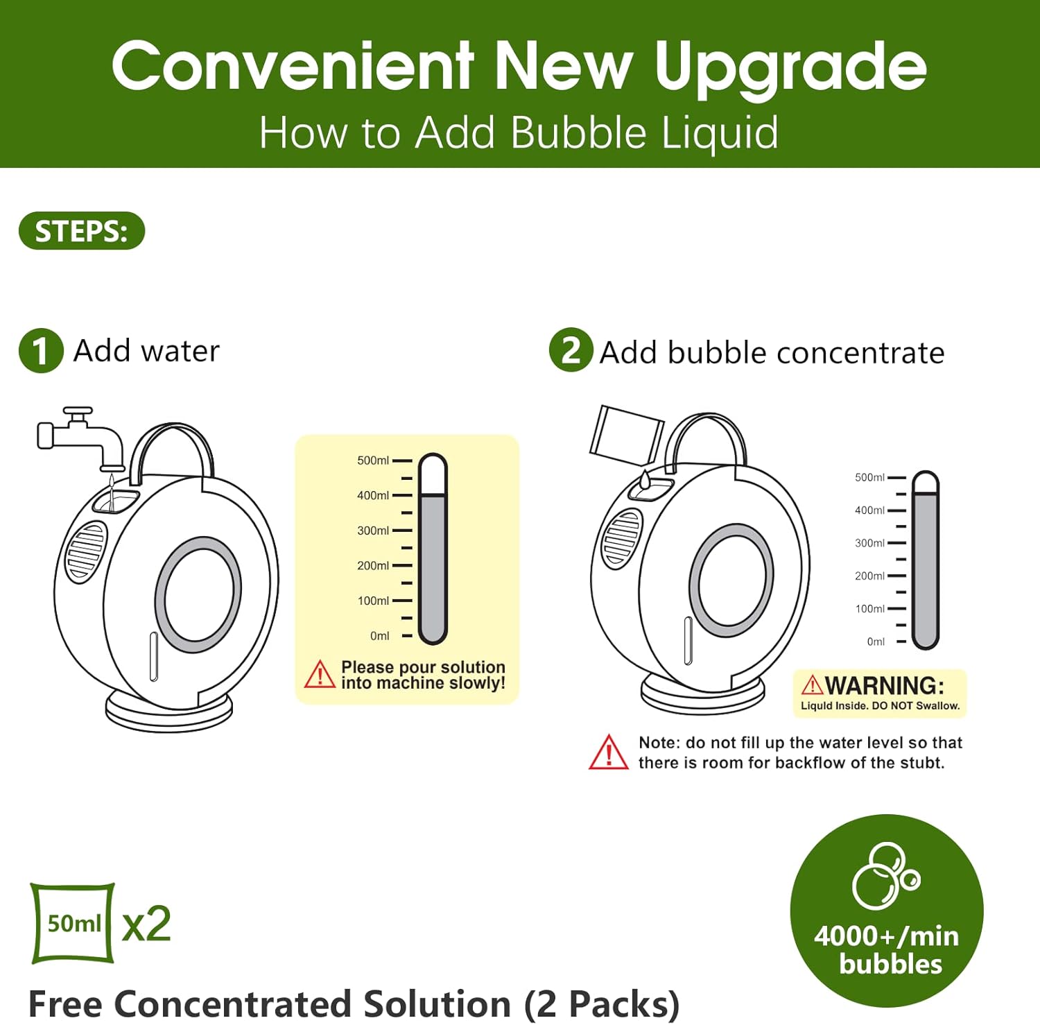 • New Water Injection Port & Free Bubble Fluid: Easier to operate, with the exclusive water filler on the surface of the bubble machine. And you may quickly clean the tank without wasting any bubble fluid by disassembling the bubble machine and removing the entire bubble fluid tank. Tip: It is best to add 50 ml of concentrated bubble solution and 450 ml of water. The solution needs to be shaken before use. Then you will get a lot of bubbles. (2 Packs 50 ml bubble concentrations are available.)