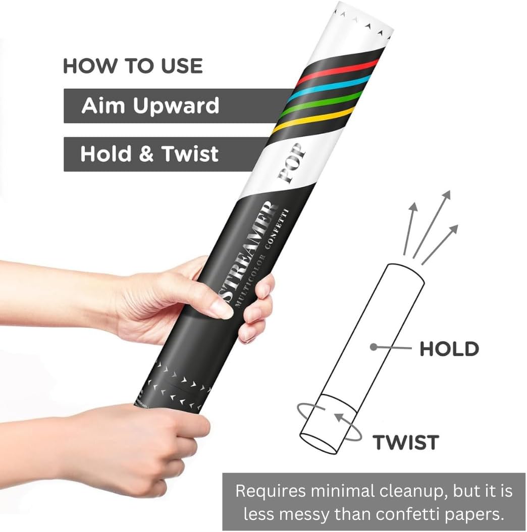 - π EASY POINT & TWIST ACTION - Don't need the strongest arms to blow up these babies! Point upwards away from people and twist to shoot, Streamer confetti paper is loaded on top of compressed air and is launched by twisting the cannon. Operation manual is included inside the box.