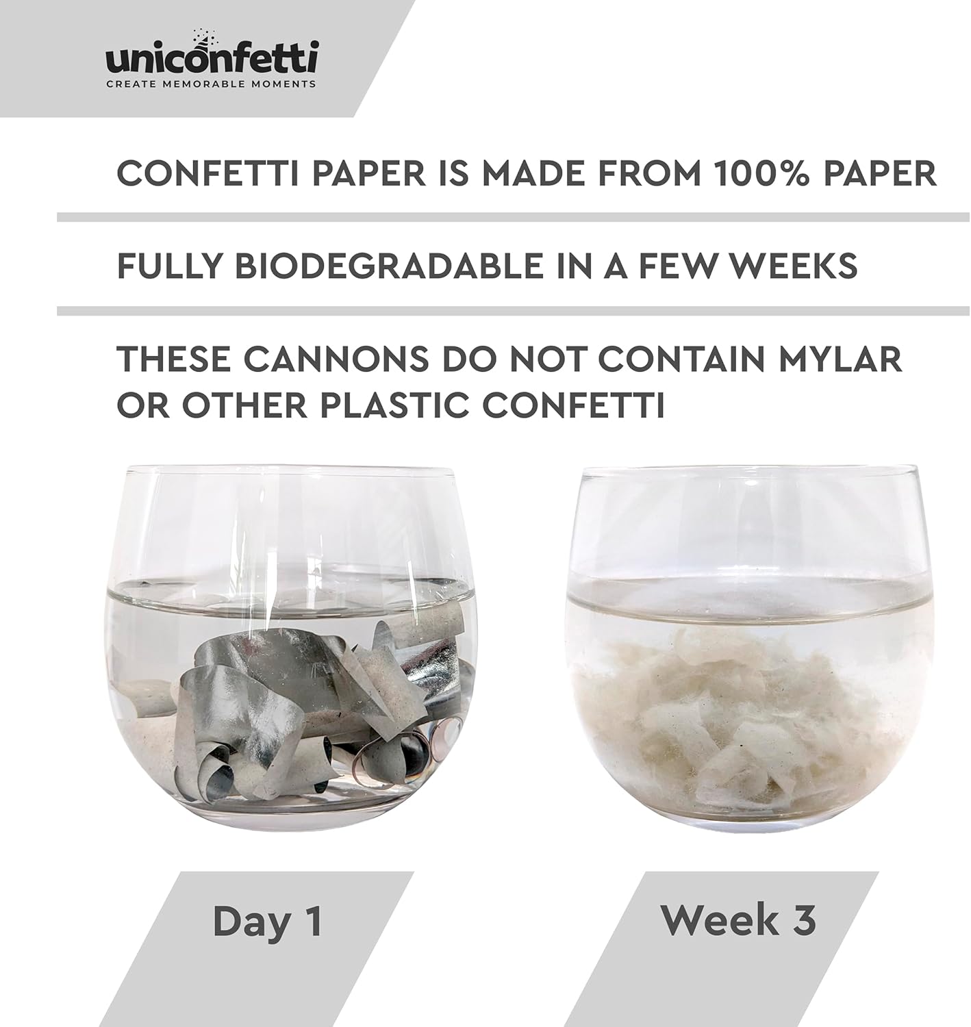 - π 100% BIODEGRADABLE [NOT PLASTIC] - SILVER Confetti is made of lightweight fire resistant tissue papers, 100% biodegradable. Our SILVER Confetti Paper is NOT PLASTIC or PVC. 100% safe for your party and good for the environment.
