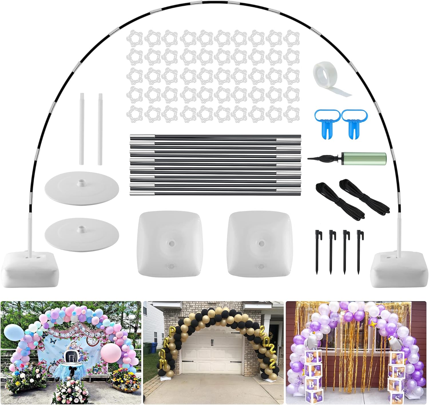 • 【Balloon Arch Kit Includes】: 2 Pvc Base, 2 Pvc Pipe, 2 Water (sand) Fillable Bag, 2 Adapters (the Innovative Necking Design, Already Installed on the Pvc Pipe), 15 Fiberglass Rods , 1 Manual Balloon Pump, 50 Balloon Clips, 2 Balloon Knotter, 2 Ground Secure Rope, 4 Ground Nails, 1 Balloon Tape (100 Glue Points). They Are Enough to Create an Atmospheric High-end Pretty Party Atmosphere.