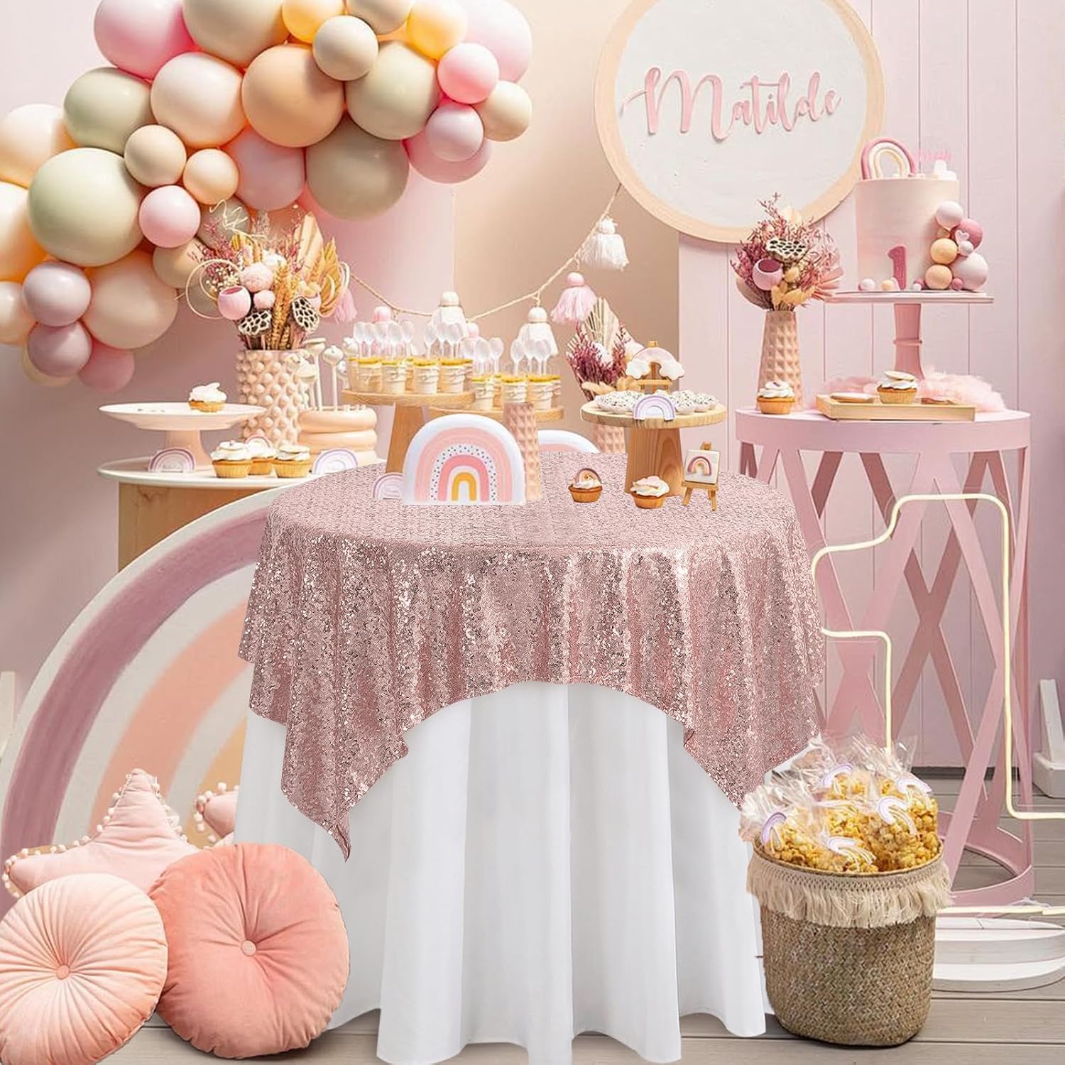 - Package Include: Your package will include 1 rosegold tablecloth measuring 50 W by 50 L inch. These sparkly table tablecloths are ideal for wedding, event table decorations for the reception.