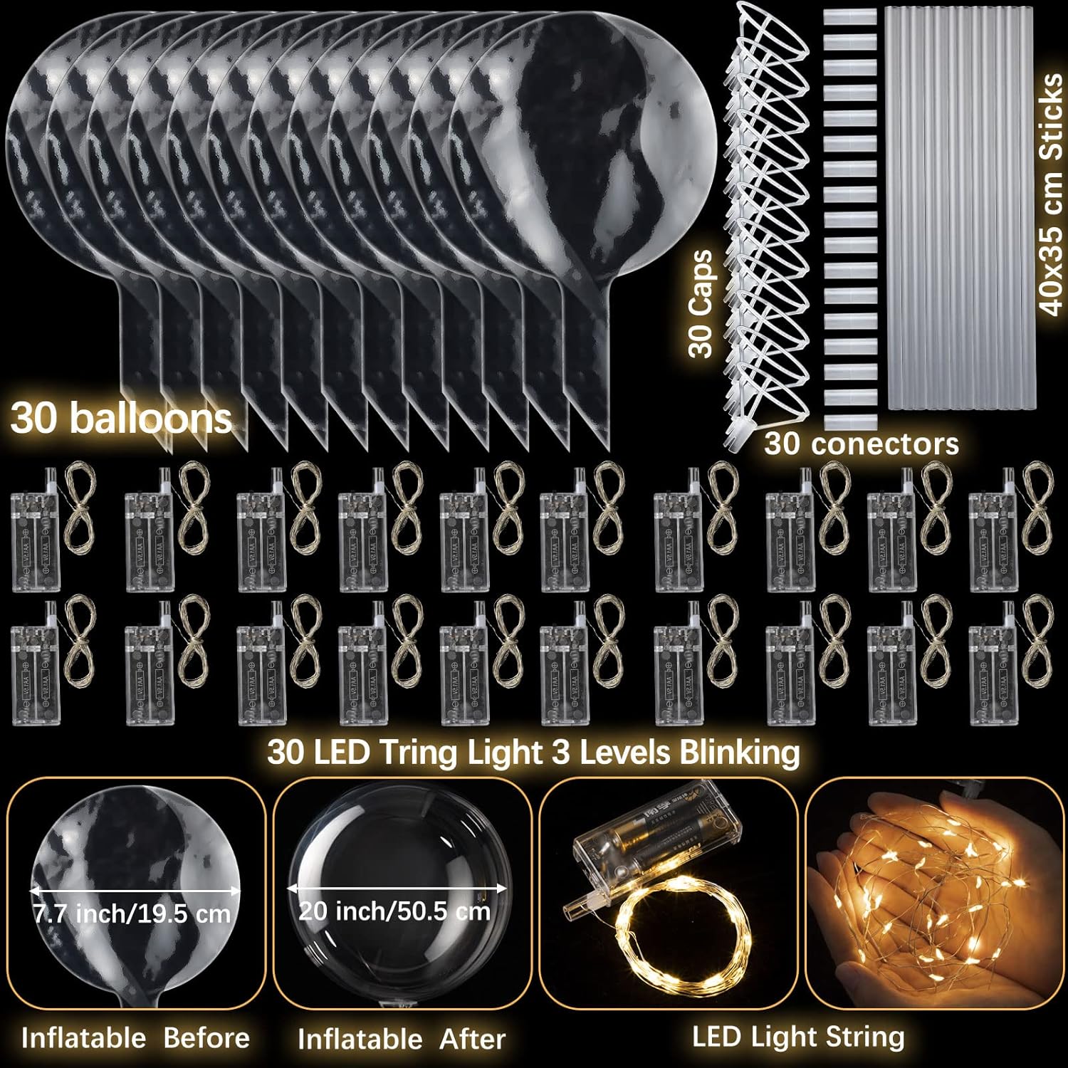 - Easy to Assemble: just fill these large balloons up with air or helium (do not inflate balloons with your mouth), string lights powered by 2 AA batteries (not included); The 8 inch balloon (deflated) can reach 20 inch when inflated; Please follow the picture tutorials on the detail page
