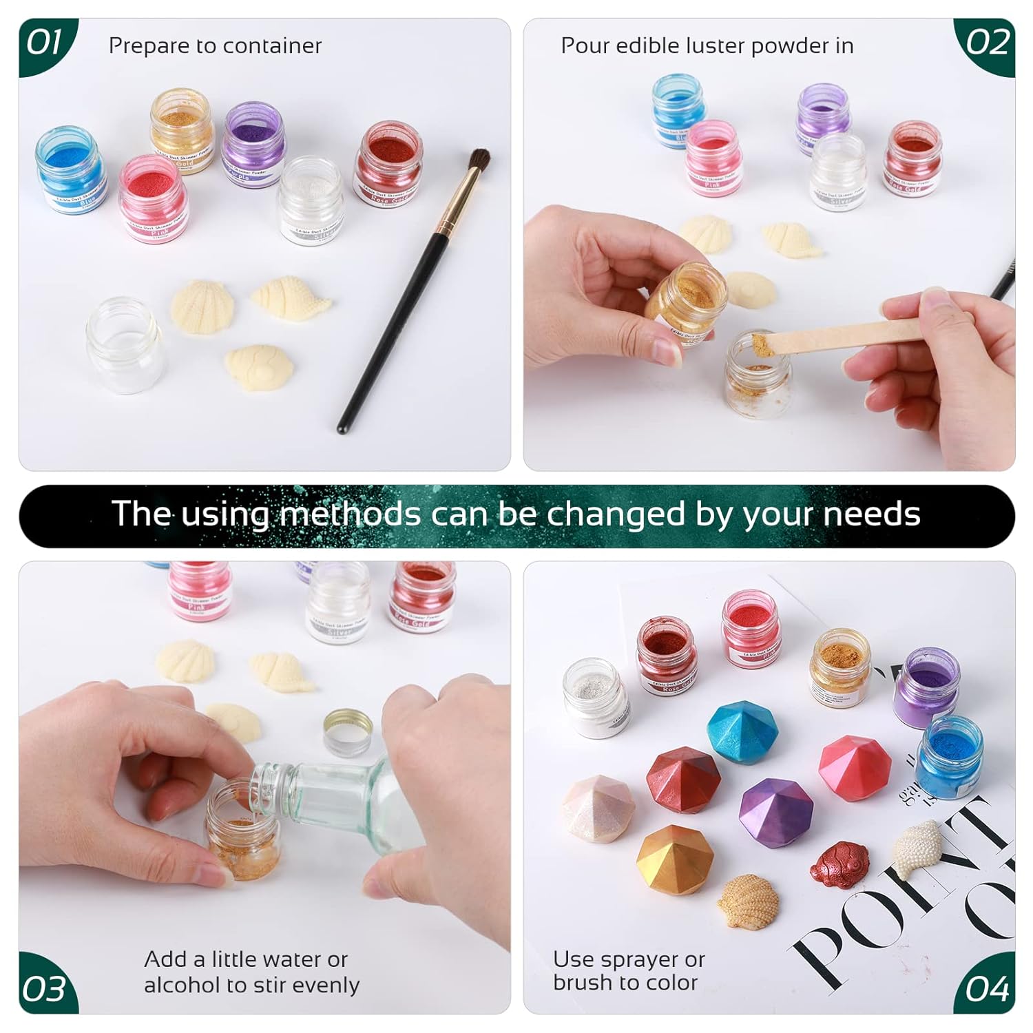 - 【Widely Used】Food-grade glossy cake decoration dust, shimmer luster powder is very suitable for chewing gum paste or fondant fudge, metal finish, fudge/chewing gum, chocolate, pull candy/isomaltose, drinks, etc.,