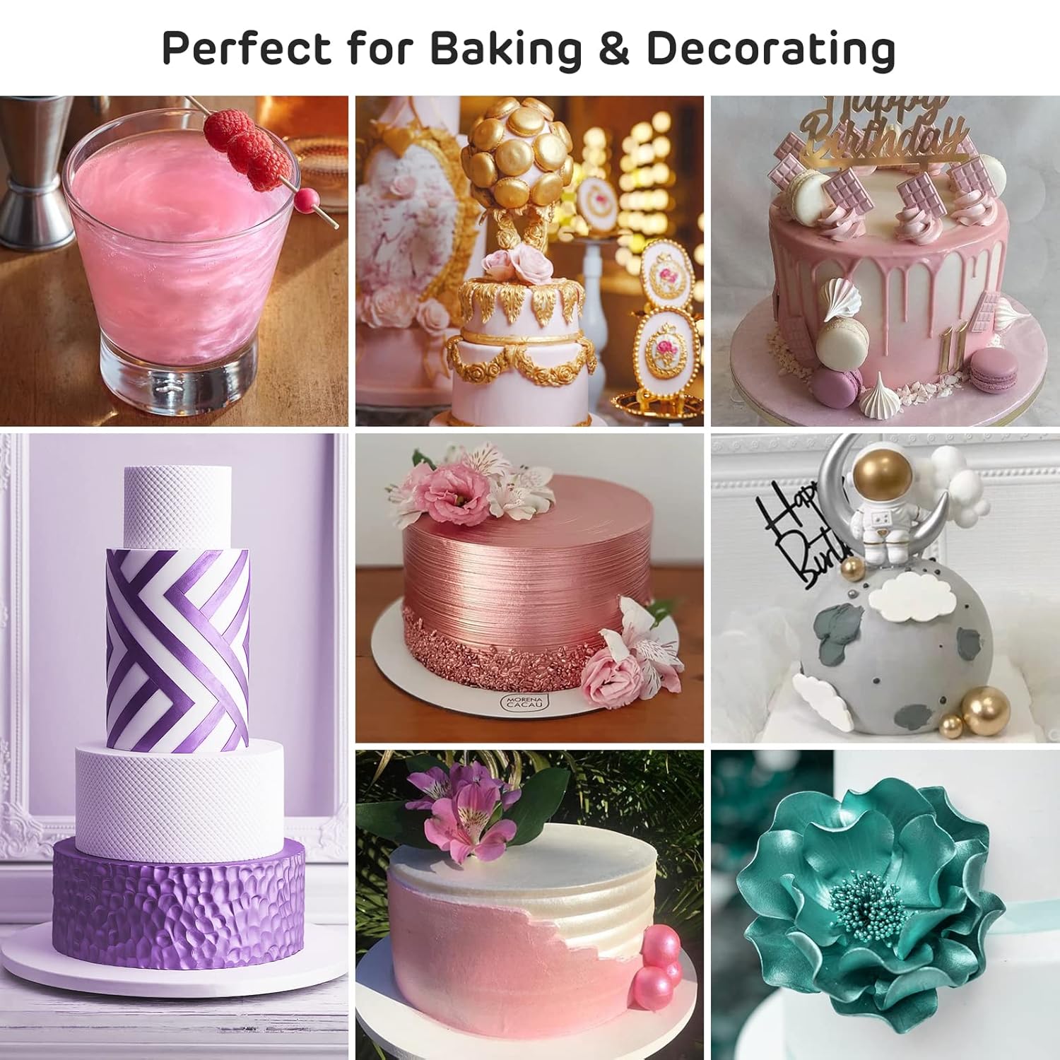 - LUXURY CAKE DUST -- Fine texture dust powder with shimmer result, this elegant luster dust helps to create high luster/glitter effect and adding a vibrant metallic finish to your project. With variety of colors to choose, gold dust is the most common colors, but the rose gold, silver, pink, bronze, Burgundy, pearl white, purple, teal and black also looks amazing
